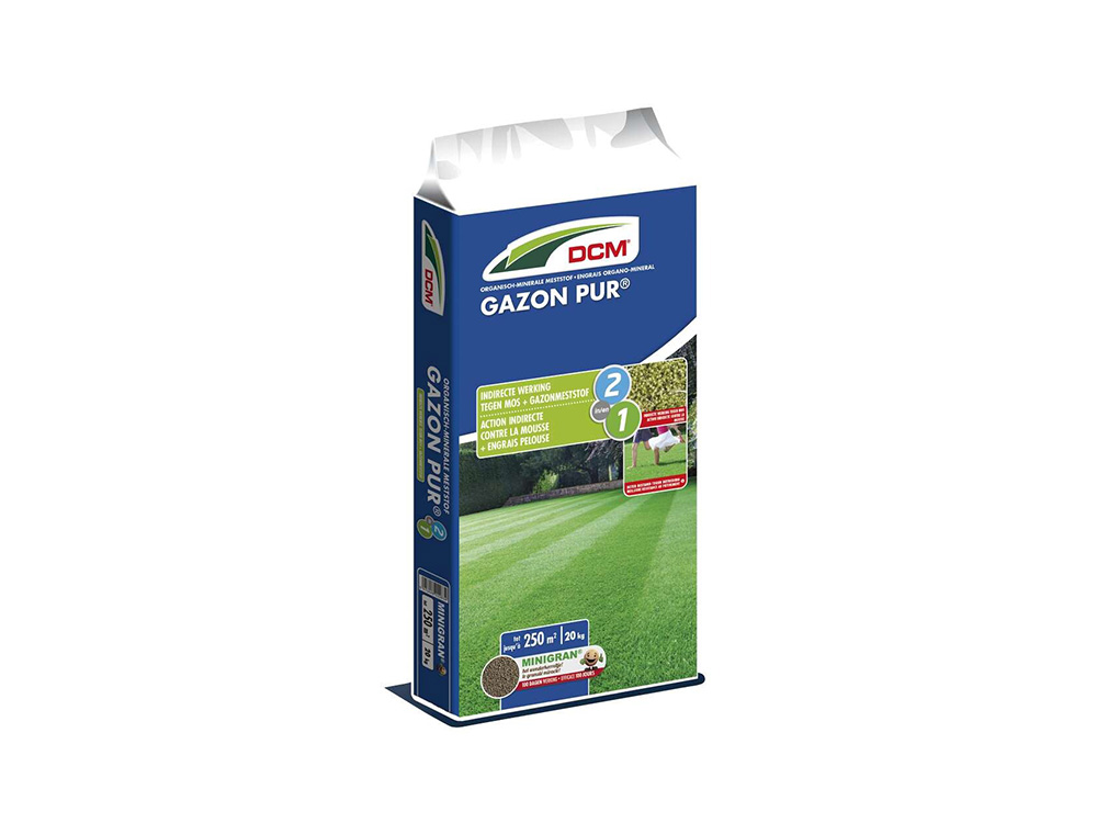 DCM Meststof Gazon Pur® als 2-in-1 product: meststof + indirecte mosbestrijding. Strooi DCM Gazon Pur en na 2 tot 3 weken zie je het mos verkleuren en afsterven.