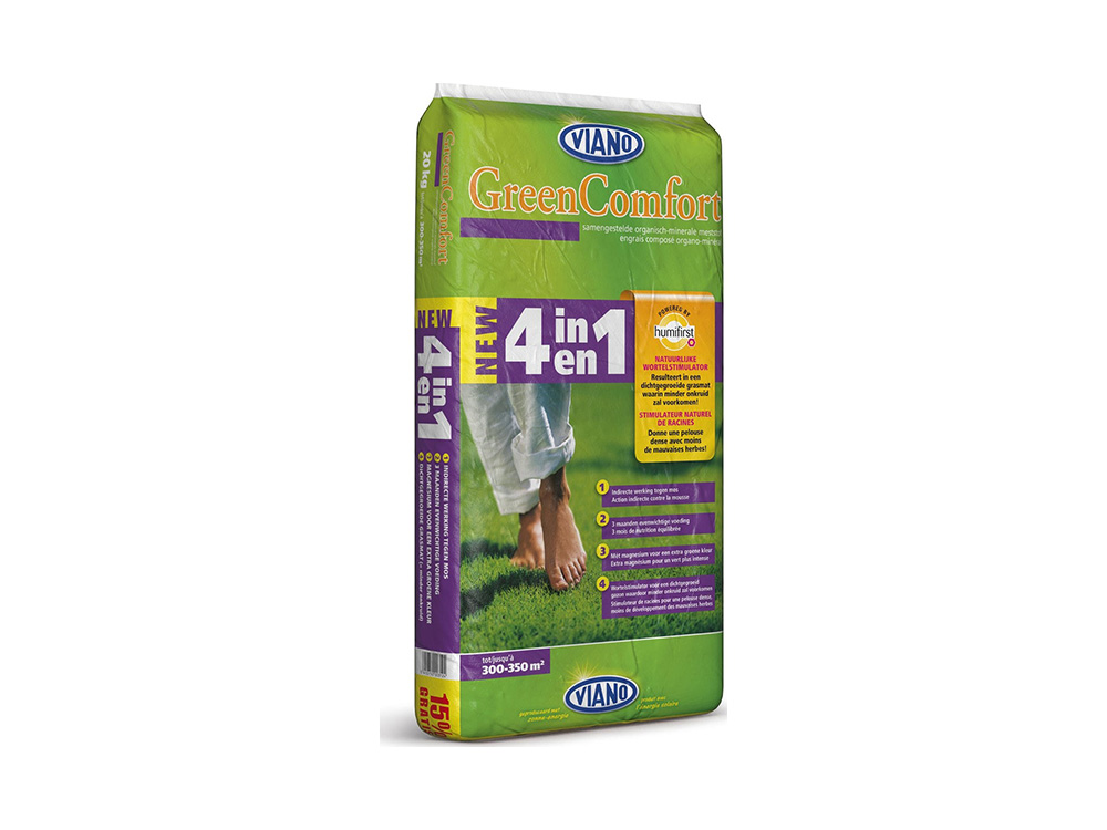 De GreenComfort 4-in-1 gazonmeststof van Viano is een samengestelde organisch-minerale meststof met een unieke wortelstimulator die voor een dichtgegroeid gazon zorgt met minder onkruid.