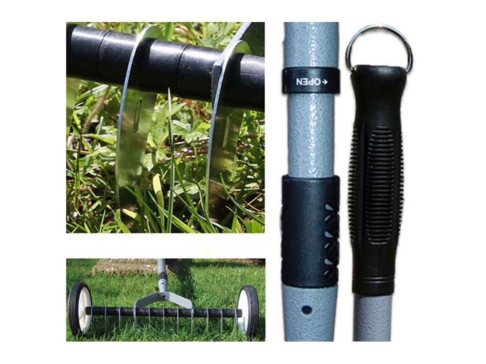 De verticuteer-roller wordt geleverd met een telescopische ijzeren steel die uitschuift van 77 tot 130 cm en voorzien is van een stevig zwart rubberen handvat. Dankzij de telescopische steel is dit gereedschap makkelijk op te bergen.