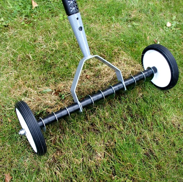 Deze verticuteerhark op wielen heeft 11 halvemaanvormige messen die door de graszode en graswortels heen snijden. Twee duurzame rubberwielen begeleiden de hark en zorgen ervoor dat je altijd op dezelfde diepte snijdt, bovendien vergemakkelijken zij het werk. De verticuteerhark wordt met trekkende bewegingen gebruikt en zorgt ervoor dat in één handeling zowel de groei van de graszode wordt gestimuleerd als de afdichtende viltlaag wordt verwijderd .
