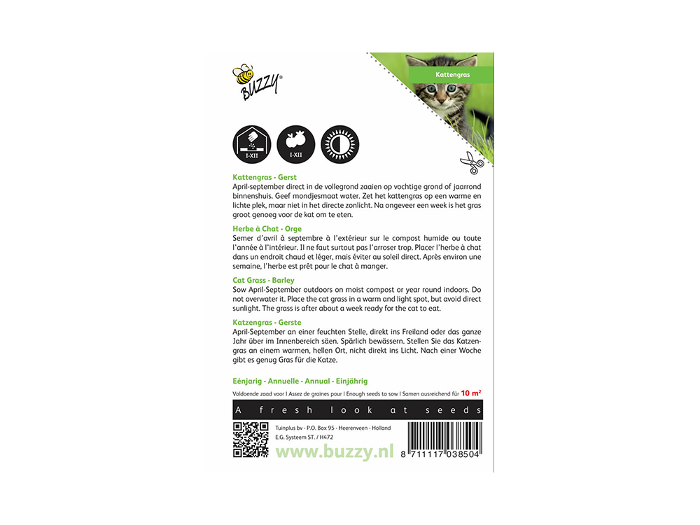 Kattengras gerstzaden kunnen het hele jaar door binnenshuis worden gezaaid, of van april tot september direct in de volle grond op een vochtige bodem. Kies een warme en lichte plek, maar vermijd direct zonlicht, en geef het gras matig water. Na ongeveer een week kan je kat van het gras genieten.