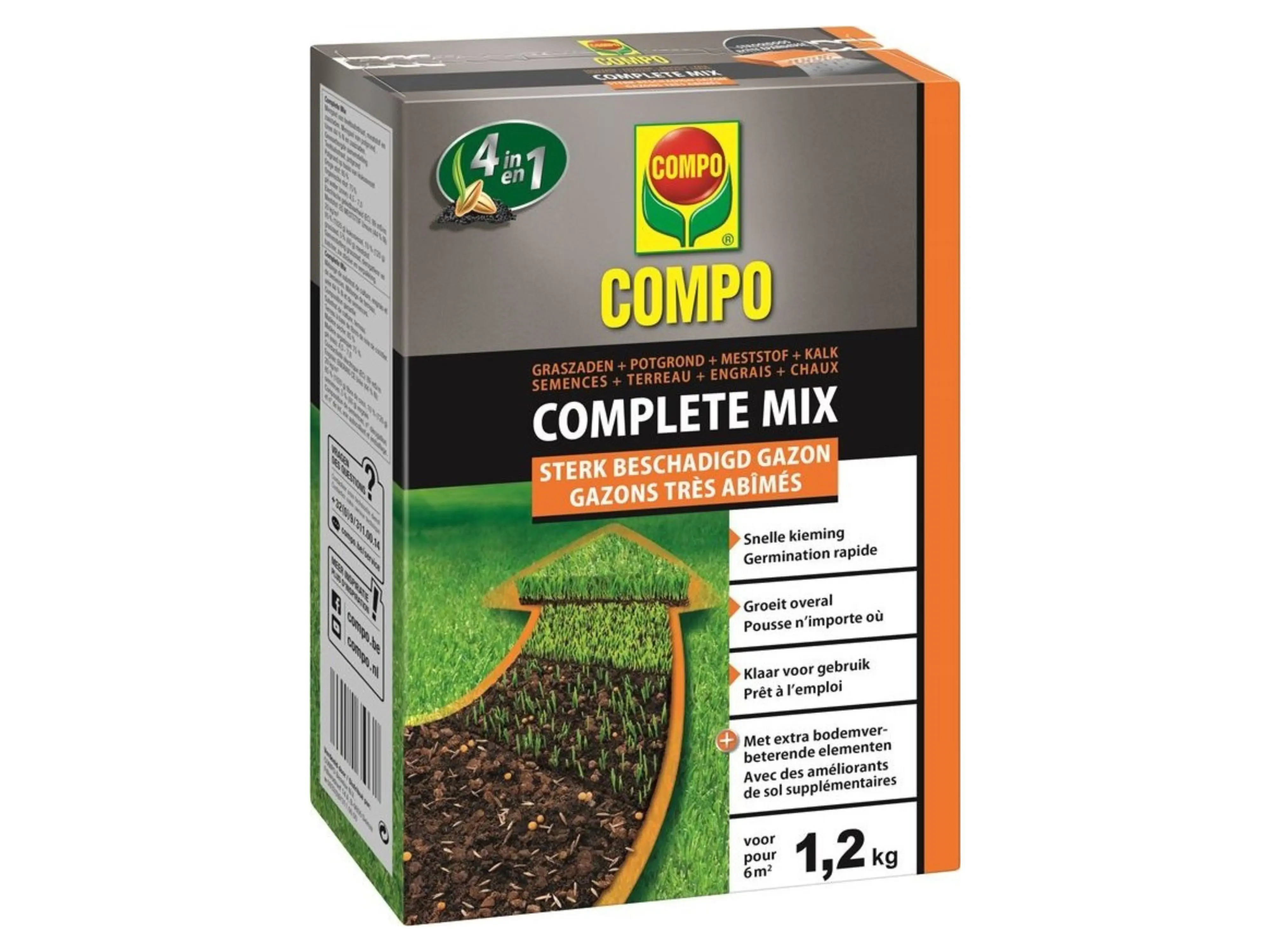 Compo Complete Mix, de snelle en eenvoudige oplossing voor een sterk beschadigd gazon! Gebruiksklare mengeling van graszaden, potgrond, meststof en kalk.