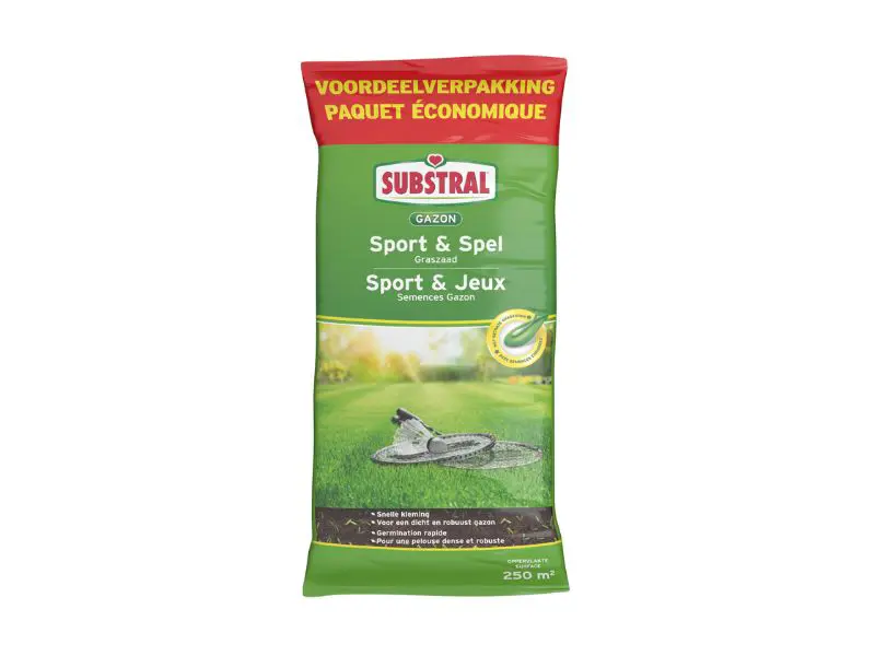 Substral Sport & Spel graszaad is geschikt voor intensief gebruikte gazons. Van sport-, speel- en schaduwgazon tot siergazon. Het grasmengsel is samengesteld uit grassoorten van professionele kwaliteit voor een superieur resultaat. Ideaal voor intensief gebruik. Kiemt en ontwikkelt zich zeer snel. Het gecoate graszaad zorgt voor een beter contact met de bodem. De coating bevat bovendien voedingsstoffen die de ontwikkeling van de zaden bevorderen.