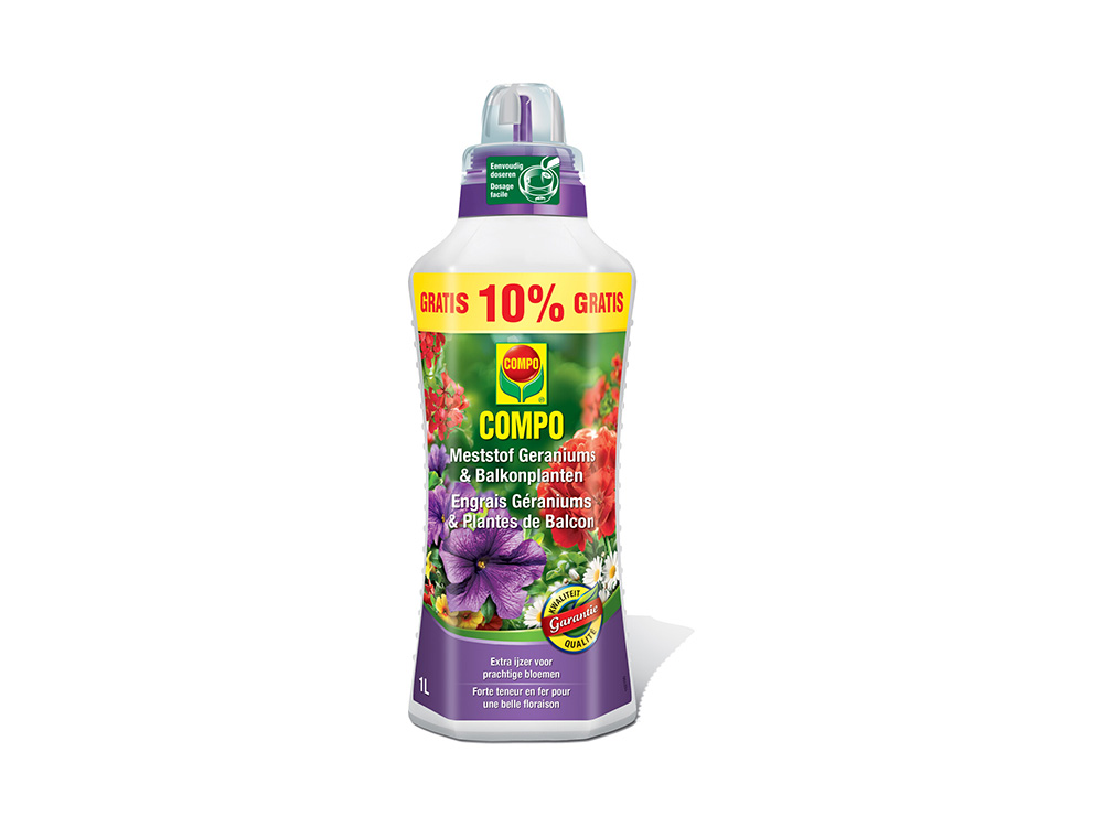 De vloeibare meststof van Compo voor Geraniums & balkonplanten biedt een milde, maar voedzame formule voor een scala aan bloeiende balkon- en terrasplanten, waaronder vergeet-mij-nietje, viooltje, primula, madeliefje, narcis, geranium, pelargonium, surfinia, petunia, dahlia, ijzerkruid, lobelia, begonia, fuchsia, afrikaantje, salie, rudbeckia, impatiens, margriet, aster, chrysant, en meer.