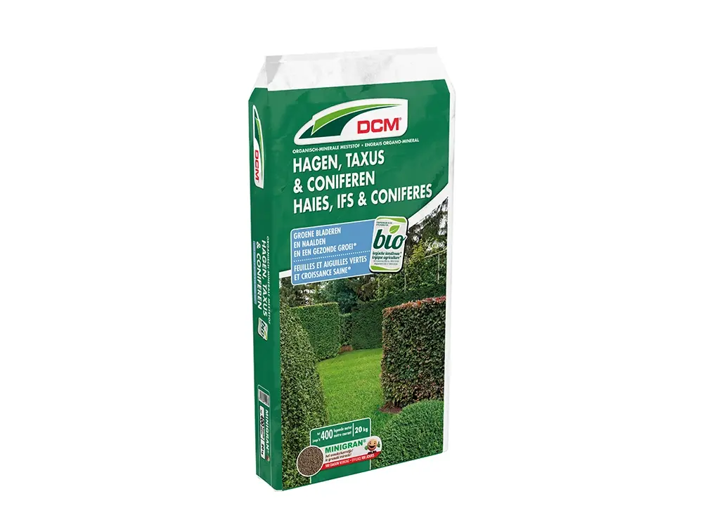 DCM Meststof Hagen, Taxus & Coniferen is afgestemd op de voedingsbehoeften van coniferen, naaldbomen, sparren, taxus en hagen. Toepasbaar in de biotuin.