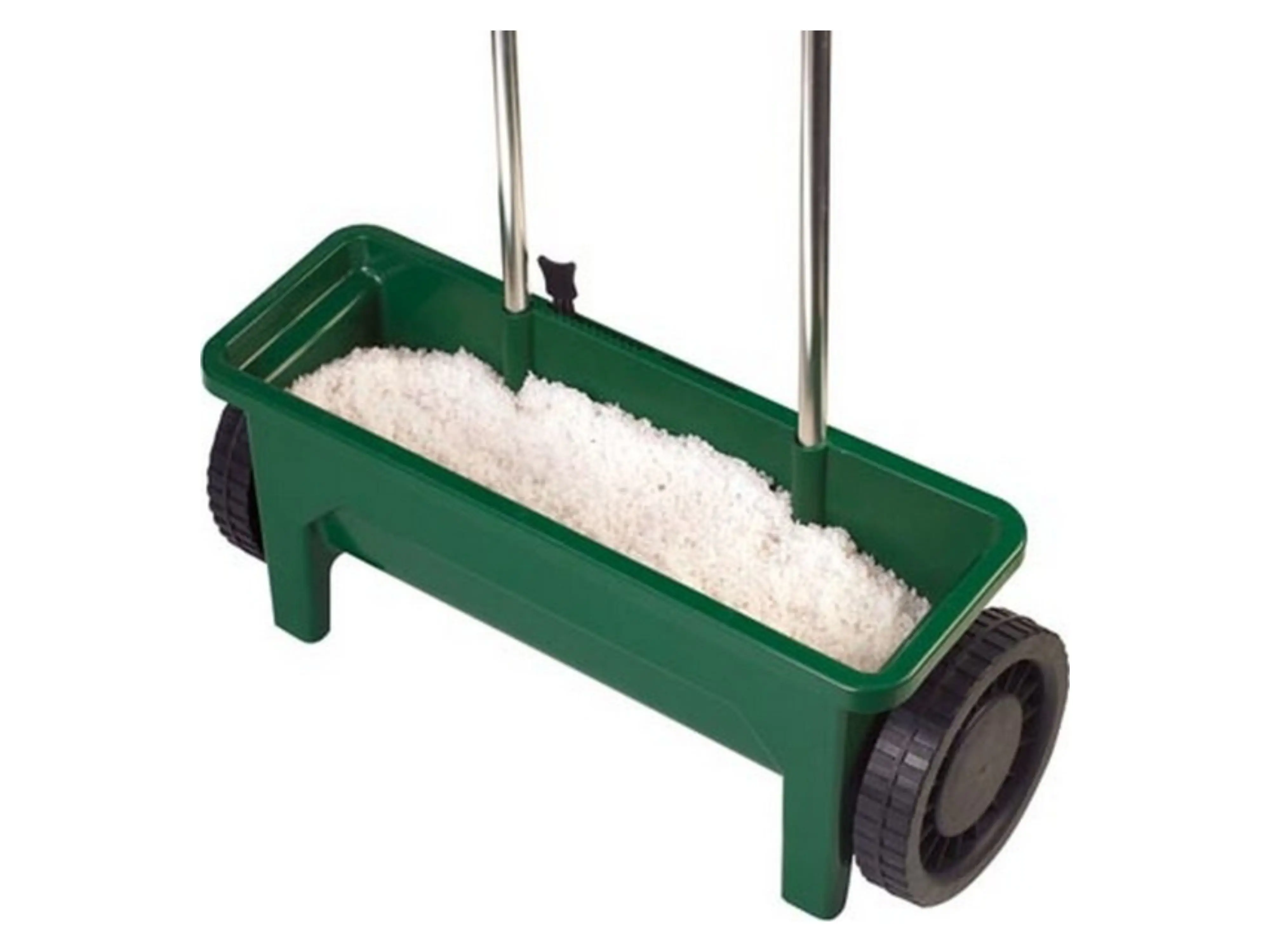 De strooiwagen uit kunststof is geschikt voor het gelijkmatig verspreiden van zaad, kalk, mest en zout met een regelsysteem in maar liefst 10 standen. De strooibreedte is 45 cm.