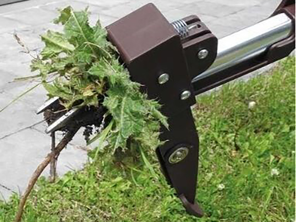 In twee stappen verwijder je zonder knielen of trekken het onkruid en zijn wortel. Met de comfortabele handgreep of het voetpedaal verwijder je vervolgens het onkruid uit de grijparmen.