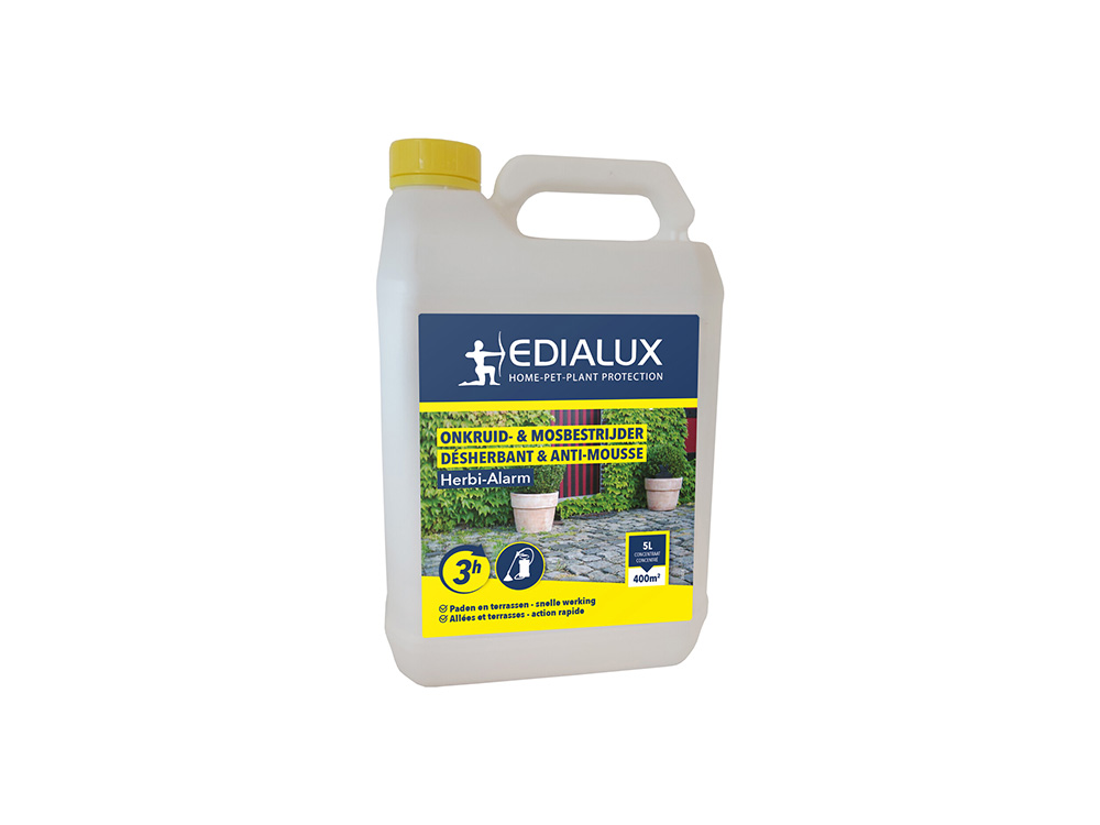 Herbi-alarm paden en terrassen is een totale, niet selectieve onkruidbestrijder voor de bestrijding van onkruiden, grassen en mossen voor verharde, permanent onbeteelde terreinen zoals opritten, paden en terrassen (asfalt, beton, kasseien en grind). Het mag ook gebruikt worden tussen de rijen van alle teelten met afschermkap op de sproeier en voor het zaaien of planten van siergrassen en groenten.