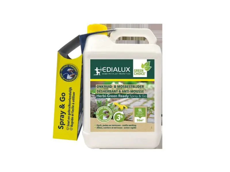 De meest kant-en-klare onkruidbestrijder op de markt: met de gratis bijgeleverde sproeikop kan je onmiddellijk aan de slag! Voor het verwijderen van onkruiden, grassen en mossen op alle oppervlakken op basis van 100% natuurlijke actieve stoffen. Spuit Herbi-Green Ready rechtstreeks en gelijkmatig op het onkruid of mos. Er zal zich gedurende 5 minuten een schuimend laagje vormen, wat toelaat te zien welke zones reeds behandeld werden. Bij temperaturen vanaf 20°C is het effect reeds zichtbaar na 3 uur.
