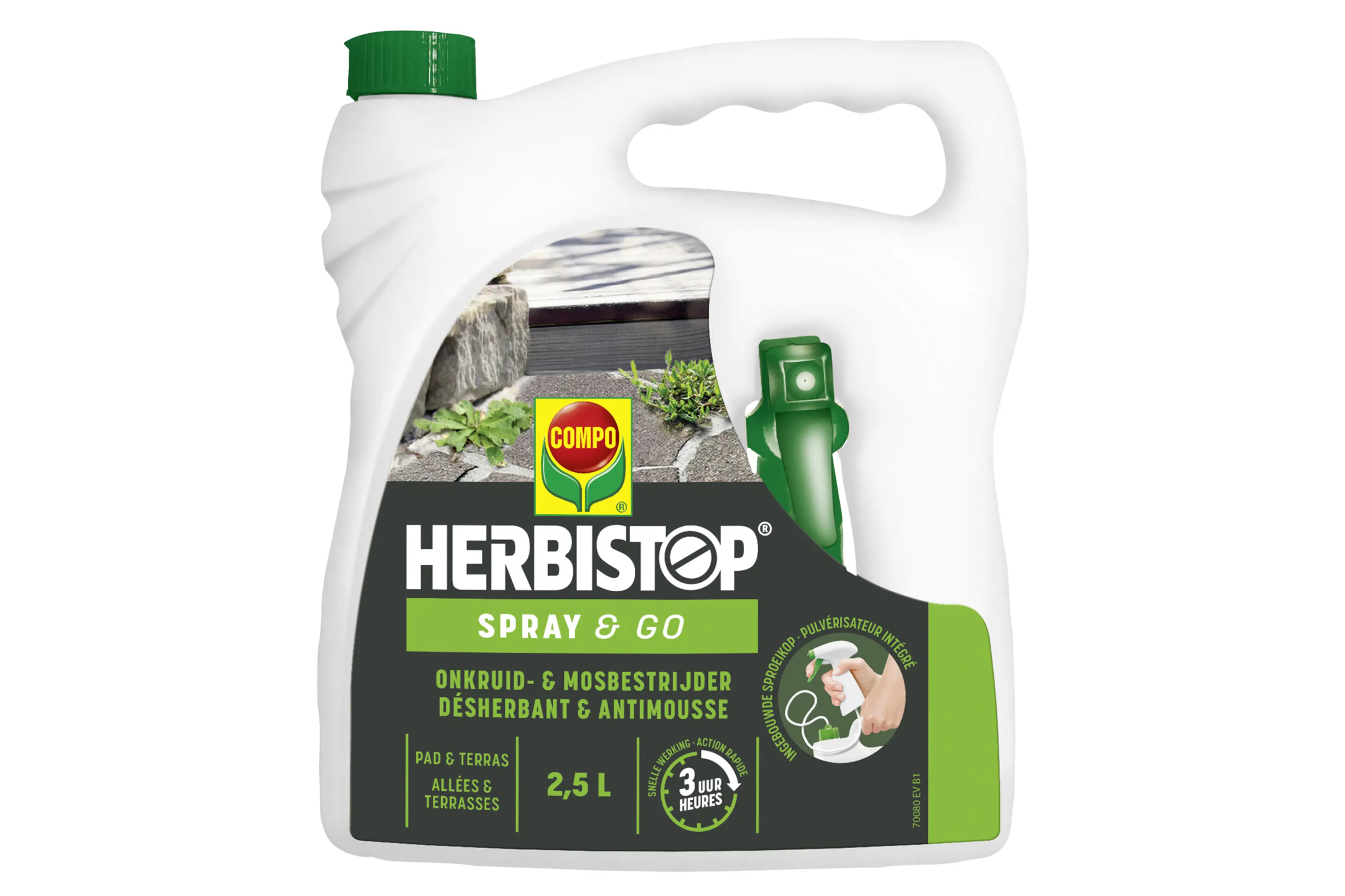 Bestrijd onkruid op het terras en andere verharde oppervlakten met Herbistop Spray & Go van Compo. Een onkruidbestrijder op basis van pelargonzuur, een 100% organisch vetzuur met contactwerking. Het middel is bovendien vrij van glyfosaat! De actieve stof dringt de waslaag van het behandelde blad binnen en beschadigt het membraan waardoor het vocht wegstroomt en het onkruid uitdroogt. Het is eveneens doeltreffend tegen mos.