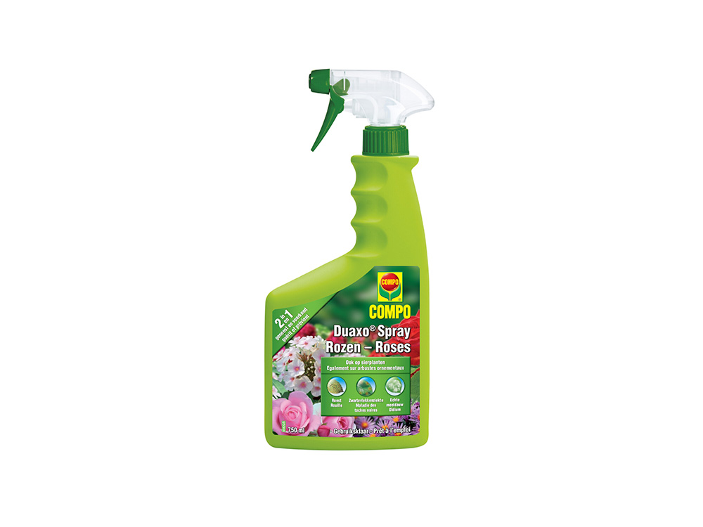 Compo Duaxo spray bestrijdt roest, echte meeldauw, bladvlekkenziekte en sterroetdauw/zwartvlekkenziekte op rozen, balkon- en terrasplanten en sierplanten (vanaf het openbreken van de knop).