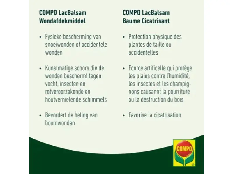 Milieuvriendelijk product voor het afdekken en beschermen van snoeivlakken en snoeiwonden, het helen van boomverwondingen en het afdichten van entingen op fruit- en sierbomen. Compo LacBalsam wondafdekmiddel voorkomt het binnendringen van vocht, insecten en rotveroorzakende en houtvernielende schimmels.