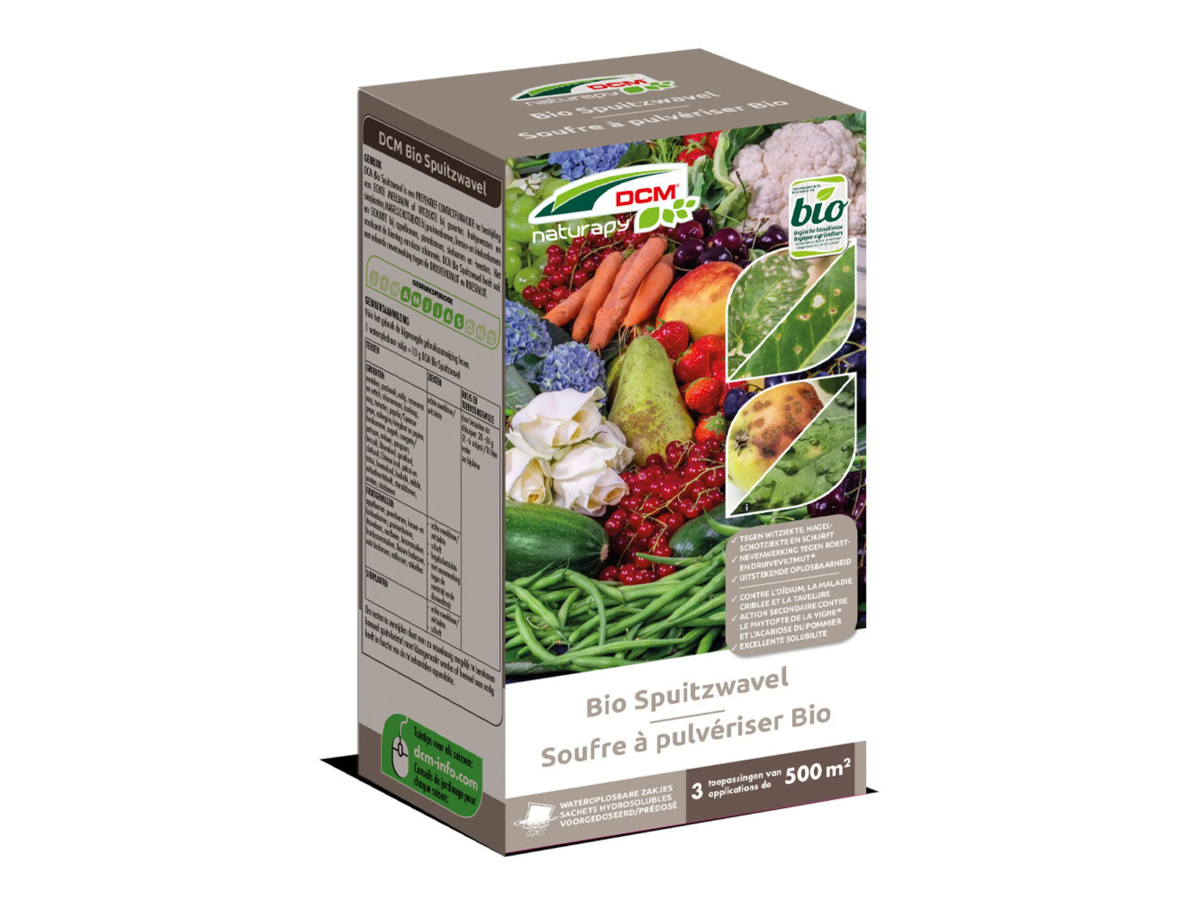 DCM spuitzwavel Bio, een preventief contactfungicide ter bestrijding van echte meeldauw of witziekte, hagelschotziekte en schurft.