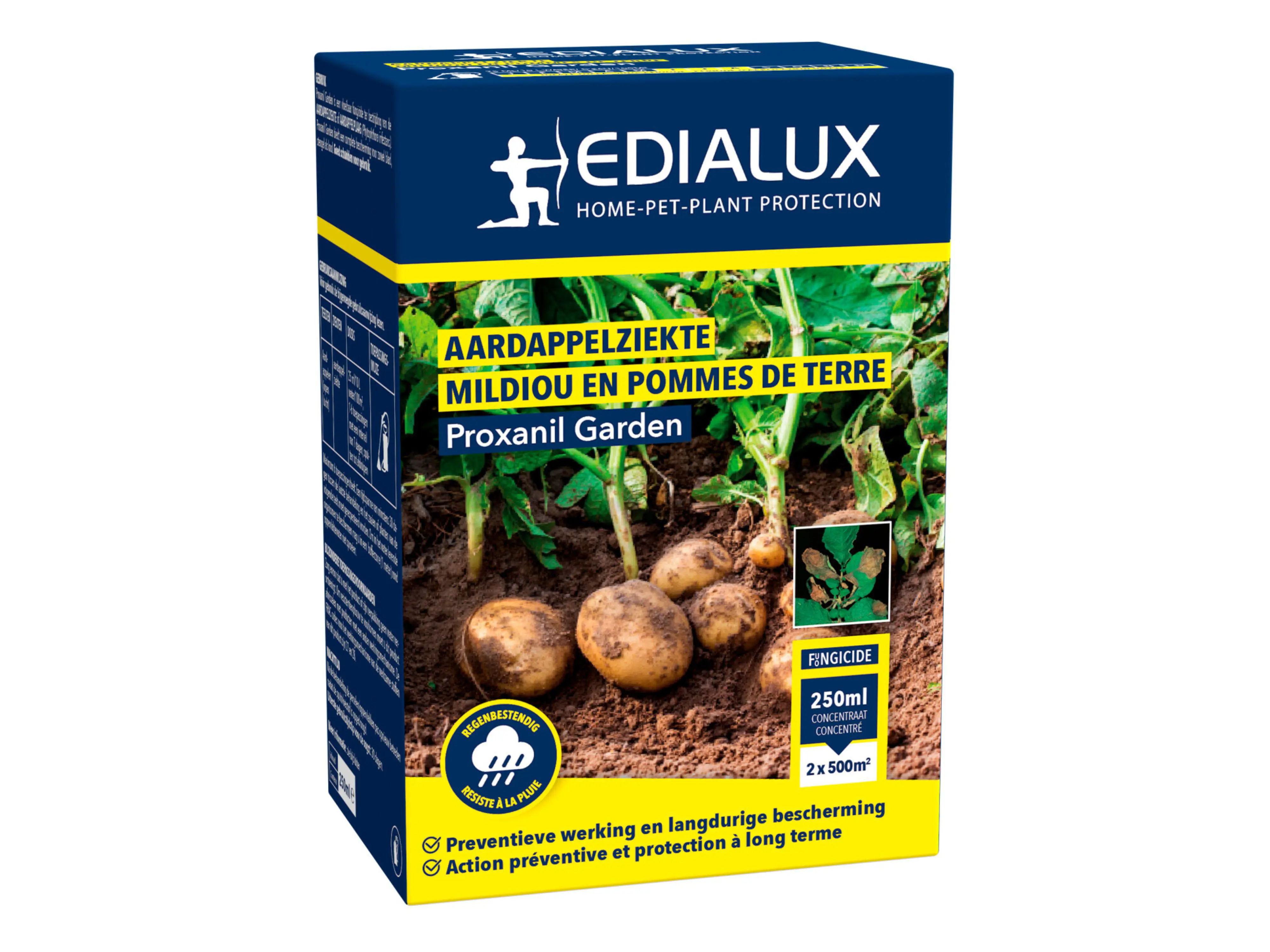 Edialux Proxanil Garden is het ideale middel ter voorkoming en genezing van de aardappelplaag. Het biedt een complete bescherming tegen aardappelziekte zowel van het blad, de stengel als de knol.