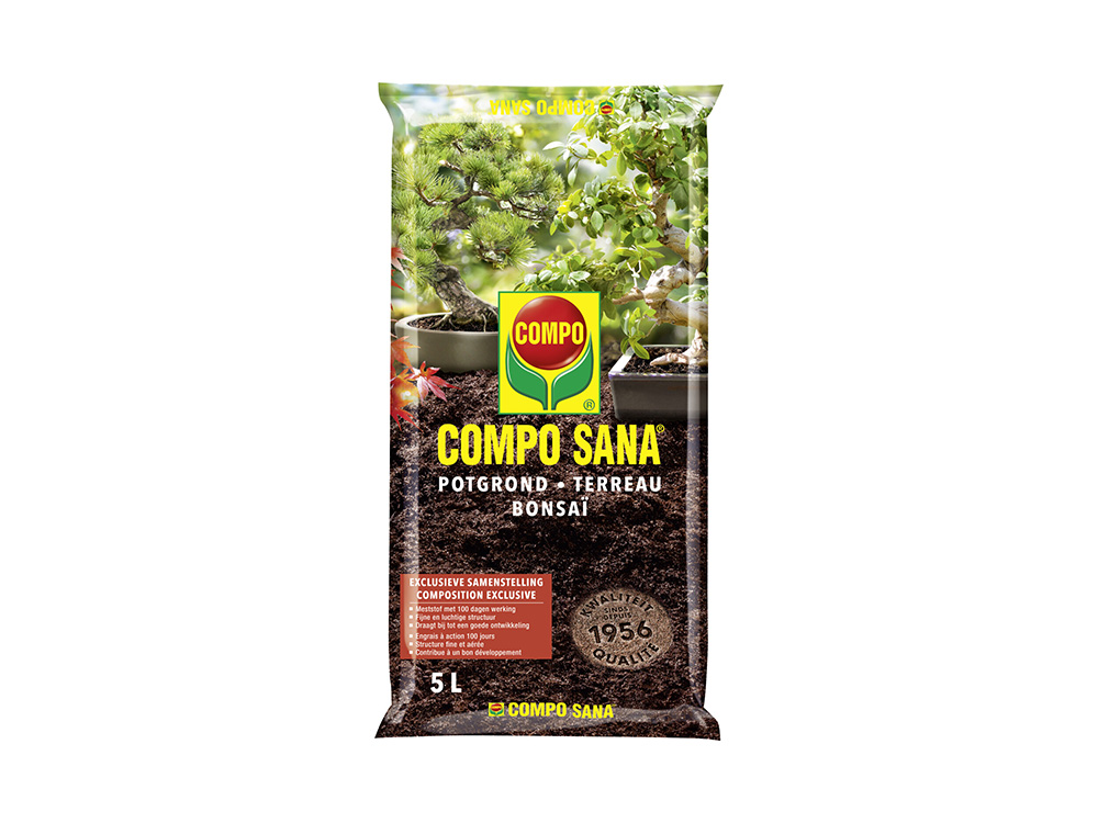 Compo Sana bonsaipotgrond is specifieke potgrond voor de aanplanting en verpotting van bonsais binnen- en buitenshuis. De structuur en hoge stabiliteit zorgen voor de vereiste verhouding water/lucht voor een goede plantenontwikkeling, een stevig wortelgestel en een uitgebalanceerde voeding.