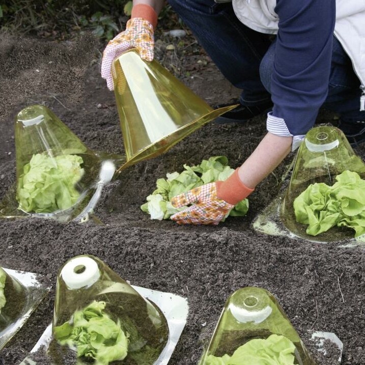 De transparante gele kunststof zorgt voor een kaseffect wat de plantengroei onder de kap ten goede komt. De noodzakelijke ventilatie vindt plaats via een gat in de bovenkant van de plantenhoed. De rand kan met aarde worden bedekt. Deze klokken kunnen meerdere malen worden hergebruikt. Ze beschermen eveneens tegen ongedierte, vogels, gure weersomstandigheden en bevorderen de plantengroei.