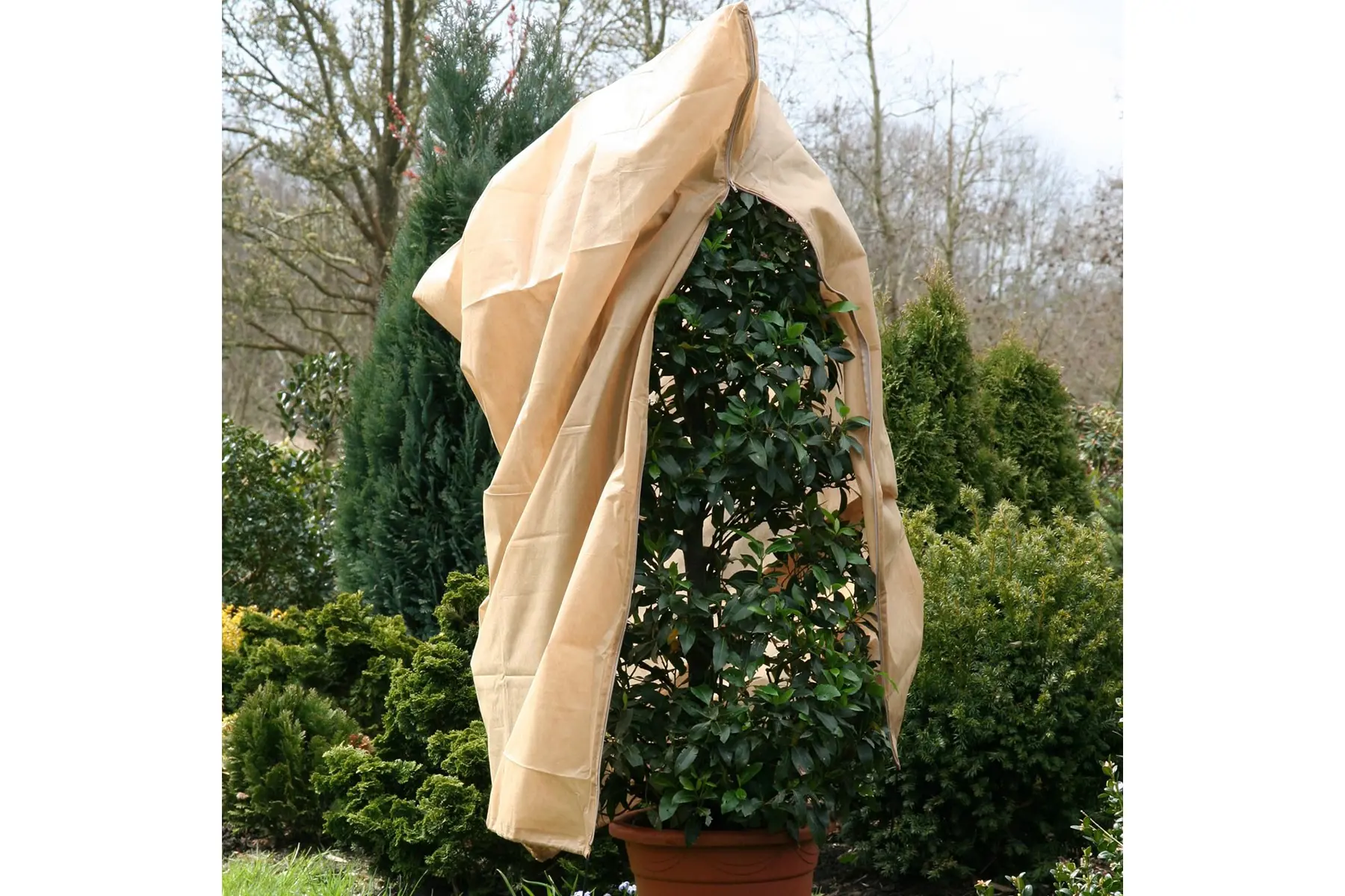 Deze vorstbeschermingshoes heeft een onopvallende natuurlijke kleur, een handige rits aan 1 lange zijde en een trekkoord om de hoes onderaan stevig rondom de plant of pot te spannen.