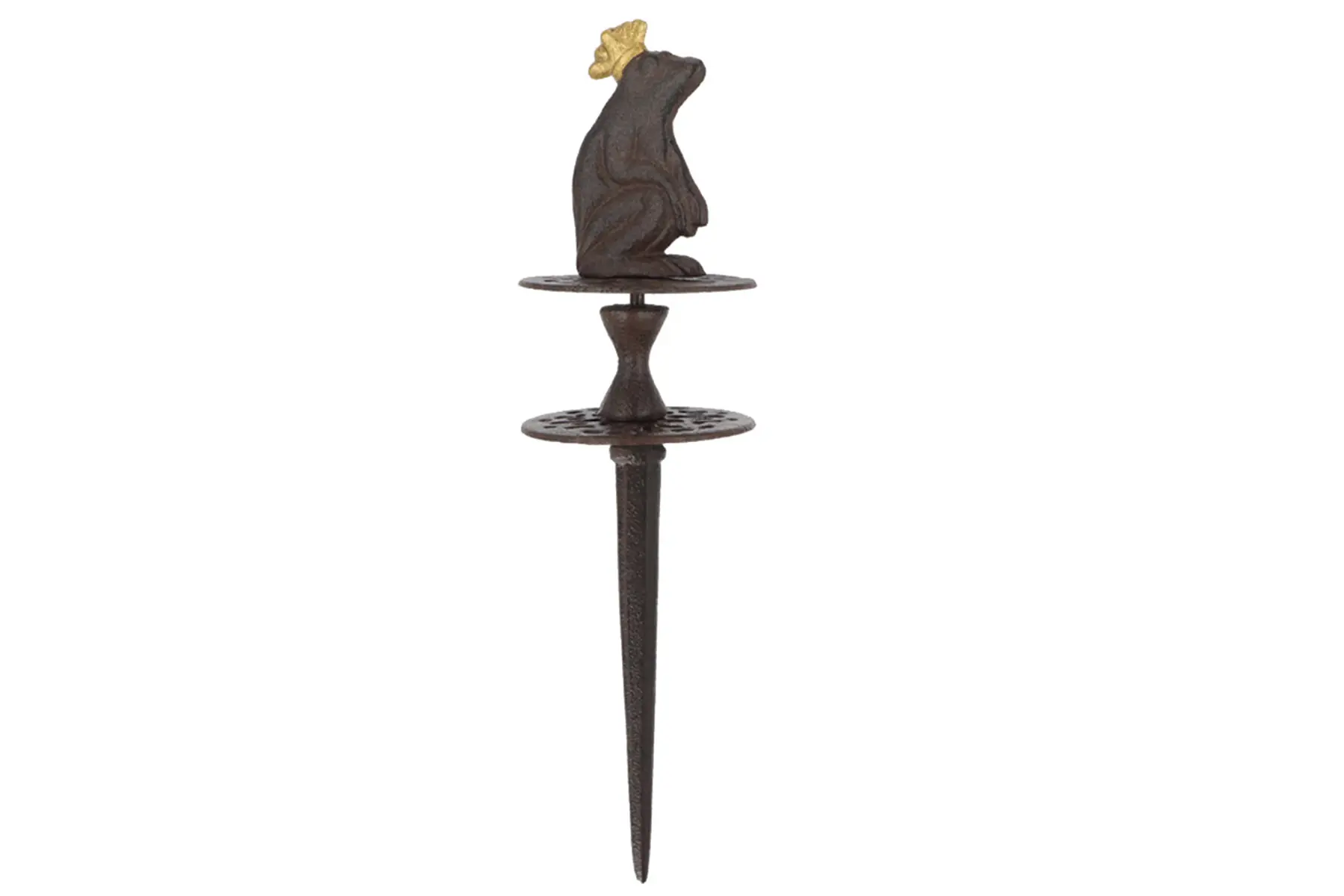 Antiekbruine gietijzeren tuinslanggeleider van Esschert design met een decoratieve kikkerkoning. Met de hulp van deze decoratieve tuinslanggeleider trek je de tuinslang bij het gieten niet meer doorheen de plantenborders, maar glijdt ze netjes langs de geleider en volgt ze de opgegeven route.