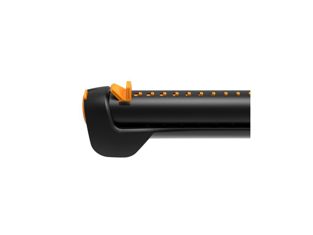Innovatieve zwenksproeier van Fiskars met ingebouwde aan/uit klep. Het sproeibereik kan worden aangepast dankzij soepel werkende regelknoppen, het volledige lengte/breedte sproeibereik kan onafhankelijk van elkaar worden ingesteld.