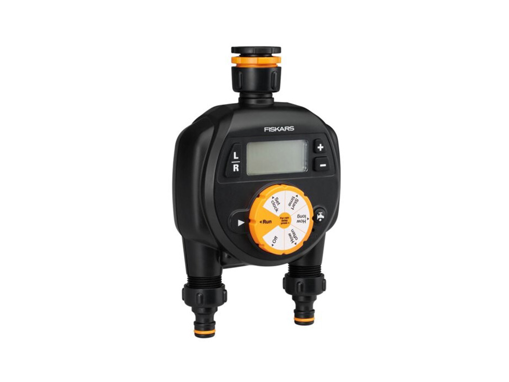 Gemakkelijk programmeerbare watertimer met dubbele uitlaat van Fiskars. Met deze watertimer met universele aansluiting bepaal je de start- en stoptijden van de bewatering alsook de frequentie en de duur. Programmeren wordt makkelijk dankzij de goed leesbare LCD-display. Beide uitlaten kunnen zowel samen als afzonderlijk worden geprogrammeerd. Via de knop voor directe bewatering kan je de kraan aanzetten zonder de programmering te doorbreken.
