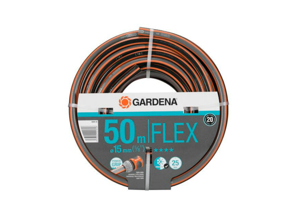 De Gardena Comfort Flex tuinslang is uitgerust met een Power Grip profiel, de perfecte verbinding tussen de tuinslang en de koppeling. De Comfort Flex is bijzonder drukbestendig en vormvast dankzij de hoge kwaliteits koolstof versterkende spiraal structuur. Ze knikt en verdraait niet en glijdt bovendien makkelijk langs obstakels.