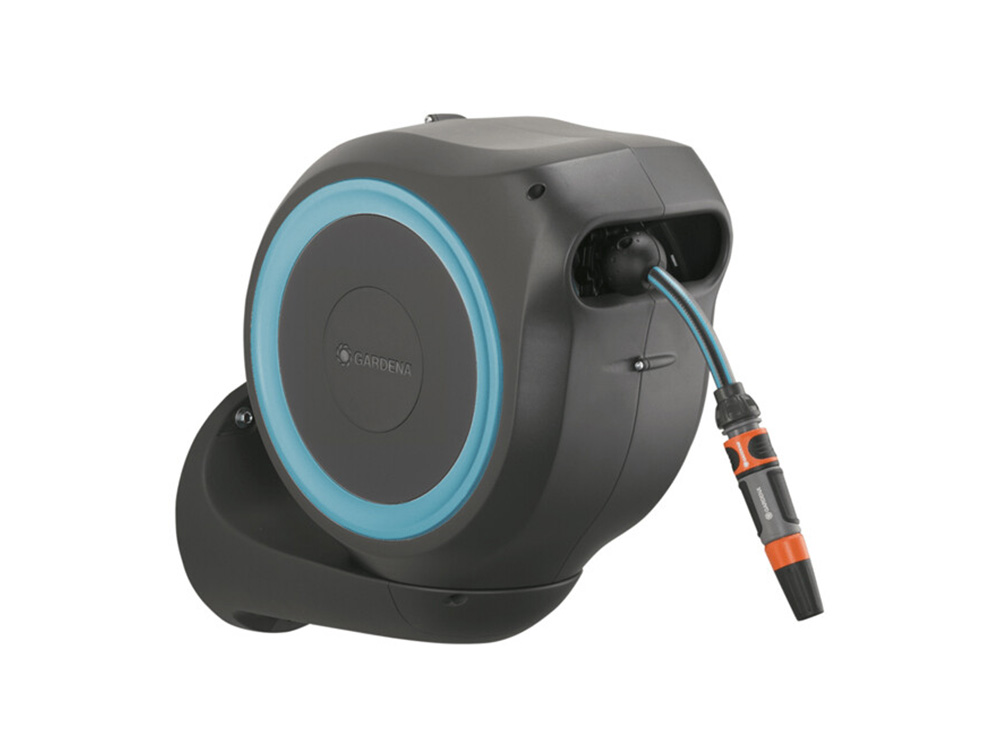 De tuinslang wordt automatisch in heel korte intervallen vergrendeld zodra je stopt, wat betekent dat de slang eenvoudig en makkelijk te hanteren is. Door lichtjes aan het uiteinde van de slang te trekken, wordt het systeem ontgrendeld. Een ingebouwde stalen veer met RollControl-technologie zorgt voor soepel en gecontroleerd oprollen. De RollControl beschermt de slangenbox en de omgeving tegen schade als gevolg van het te snel inrollen. Om knikken of knopen in de slang te voorkomen, heeft de box een geïntegreerde slanggeleider.