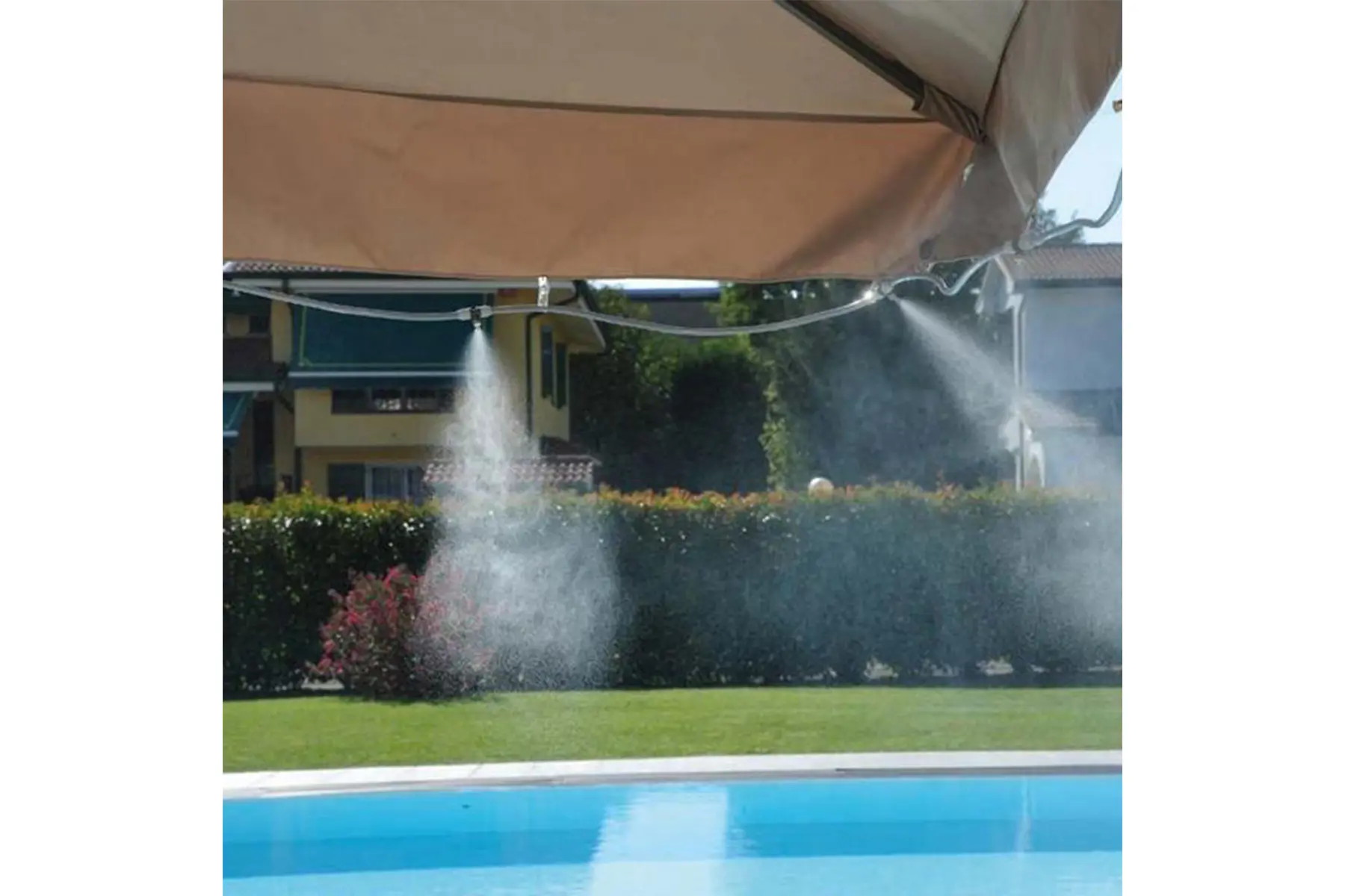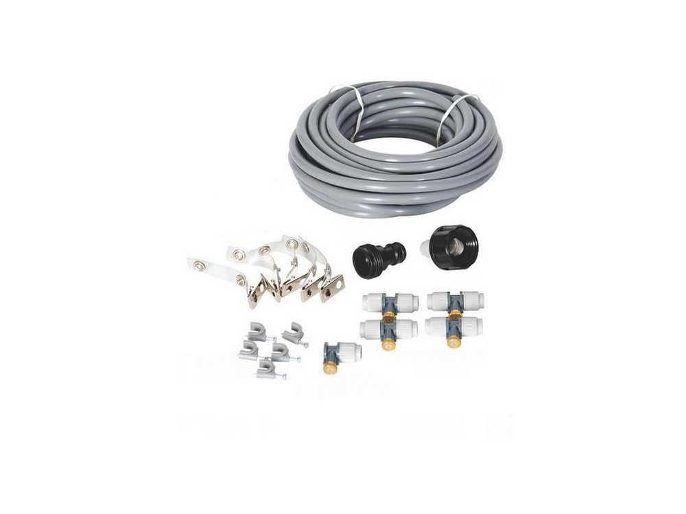 Ook op zoek naar verkoeling tijdens een warme zomerdag? Dit systeem is dan zeker de oplossing voor jou! Hang het vernevelingssysteem gewoon aan jouw parasol, prieel of aan jouw terrasmuur en ervaar een aangename verfrissende waternevel boven jouw ligzetel!
