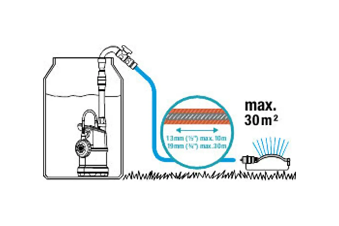 Zowel de pomp als de aansluitapparatuur zijn goed beschermd dankzij de geïntegreerde en eenvoudig te reinigen filter. Wanneer de regenton leeg is, wordt de vlotterschakelaar actief, dit voorkomt schade door drooglopen. Stel eenvoudig de in- en uitschakelhoogte naar wens in. Ook een continue werking kan om leeg te pompen tot een waterhoogte van ca. 5 mm.