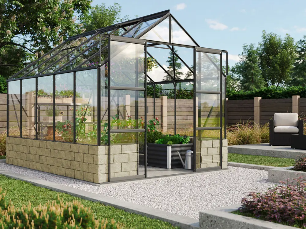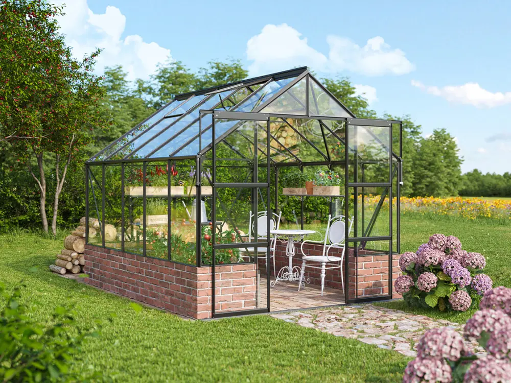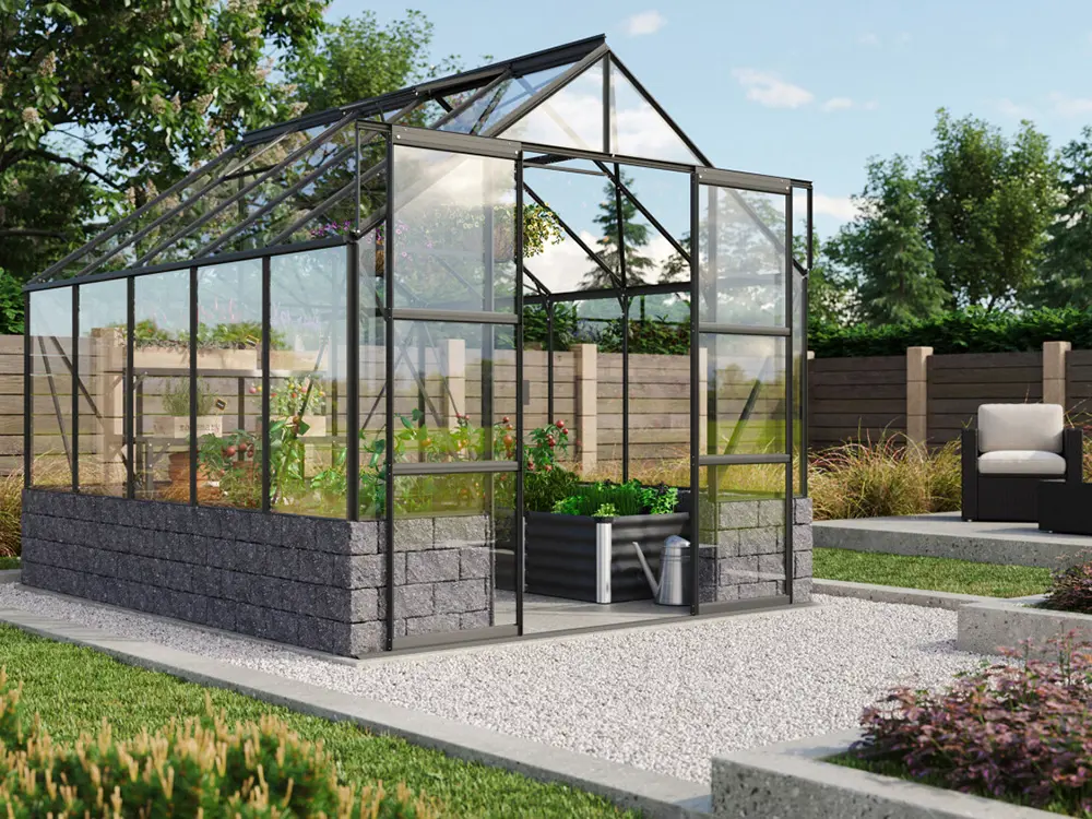 Mercurius is een fraai ogende tuinkas speciaal ontworpen voor de veeleisende tuinier die zowel kwaliteit als esthetiek belangrijk vindt. De kas dient op een stenen of houten wand/muur met een hoogte van 50 cm gemonteerd te worden. Deze onderbouw verhoogt de isolatie en dus ook het rendement van jouw kas. Het zorgt bovendien voor een persoonlijke touch zodat de kas helemaal naar jouw stijl kan worden opgebouwd. Het frame bestaat uit stevige, zwart gepoedercoate aluminium profielen.