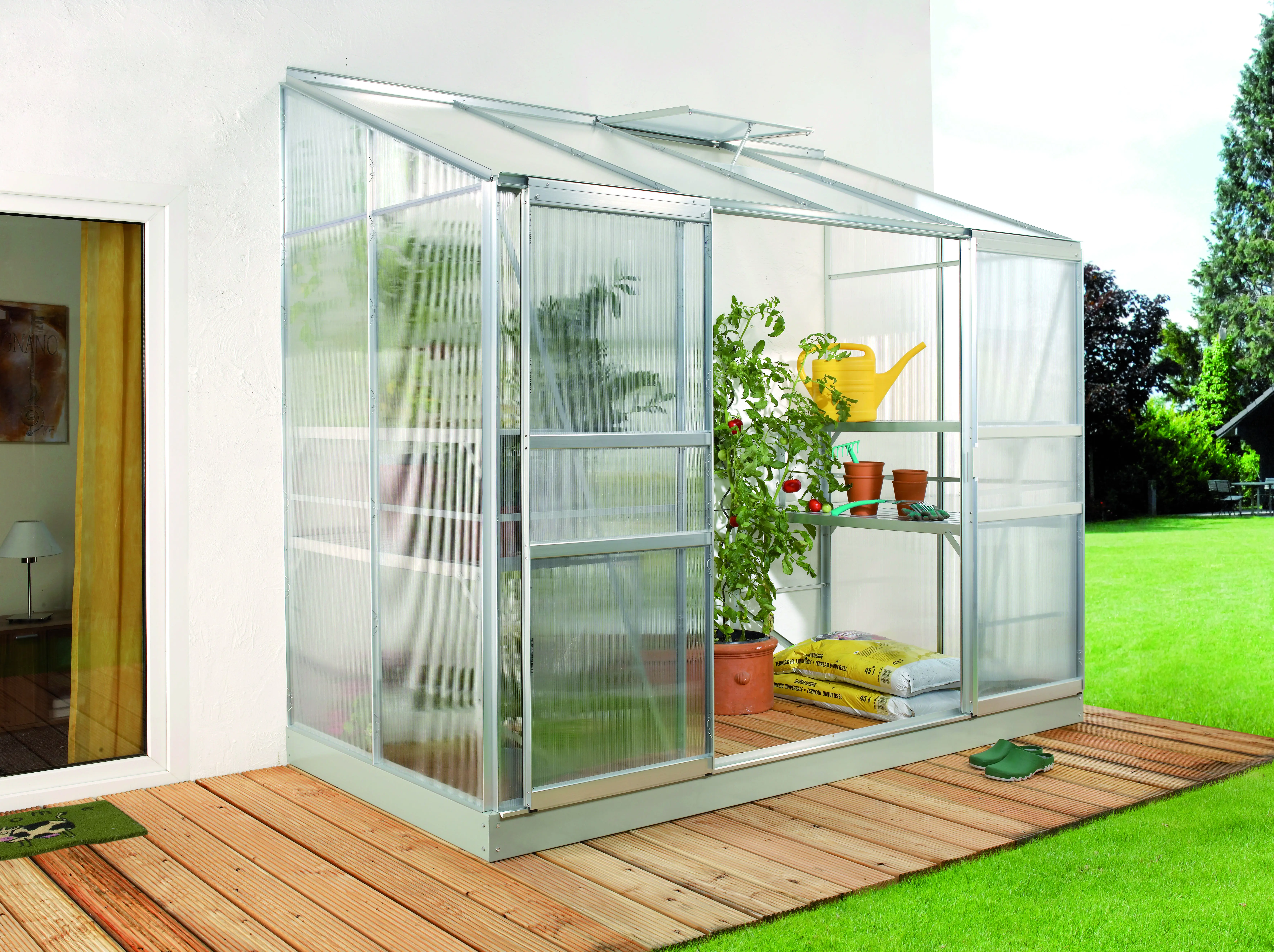 De hoge nok en de soepel schuivende enkele of dubbele deur maken de kas vlot toegankelijk, terwijl één of twee dakramen (afhankelijk van de grootte) zorgen voor een goed geventileerde ruimte. De robuuste profielen van gepoedercoat aluminium blijven jarenlang mooi en onderhoudsvriendelijk.