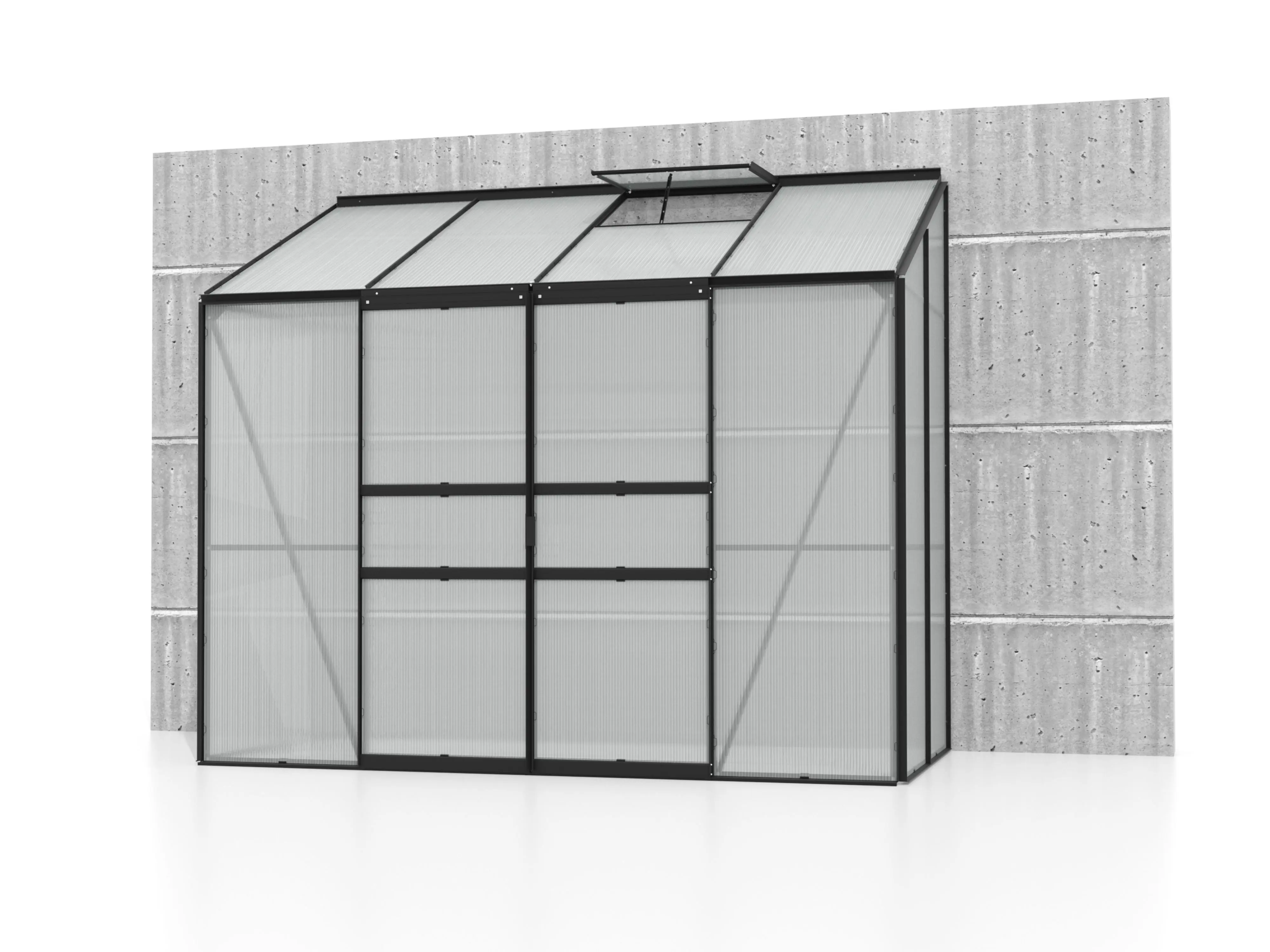 De hoge nok en de soepel schuivende enkele of dubbele deur maken de kas vlot toegankelijk, terwijl één of twee dakramen (afhankelijk van de grootte) zorgen voor een goed geventileerde ruimte. De robuuste profielen van gepoedercoat aluminium blijven jarenlang mooi en onderhoudsvriendelijk.