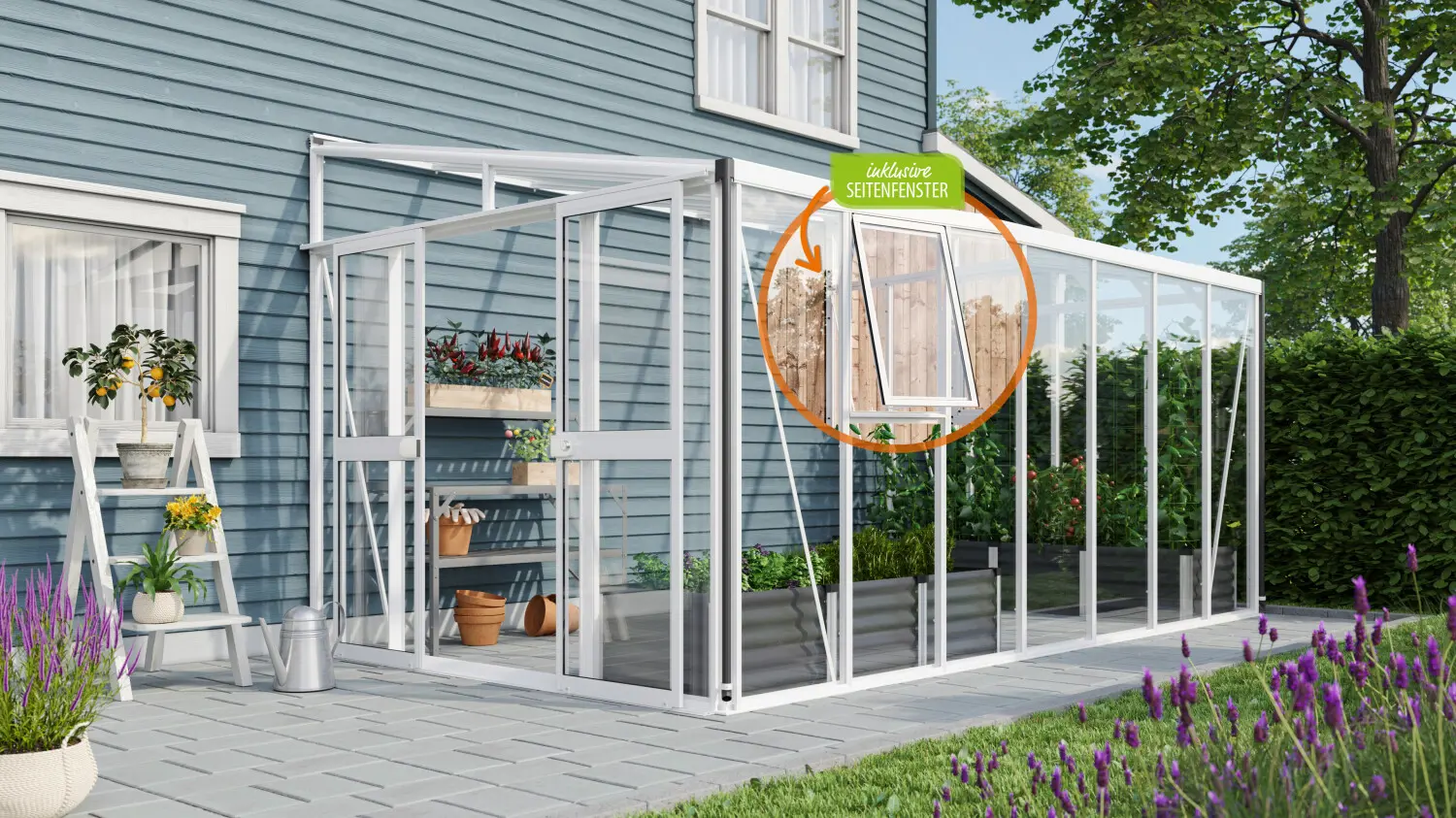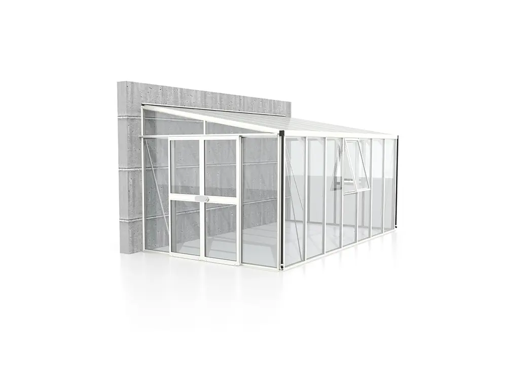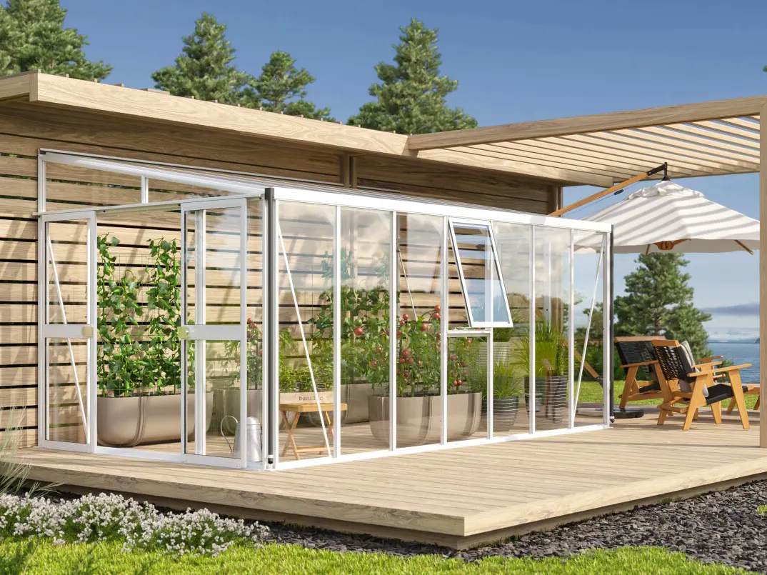 De flexibele dubbele schuifdeur (119 x 177 cm) kan naar wens aan de voor- of zijkant worden geplaatst en is uitgerust met een robuust cilinderslot. De kas wordt standaard geleverd met twee zijramen voor optimale ventilatie, een regenafvoergoot en twee regenpijpen om regenwater efficiënt af te voeren.