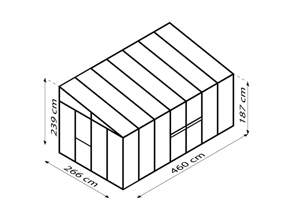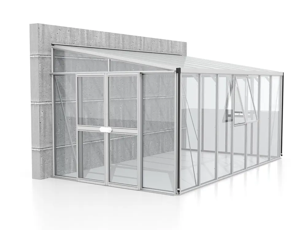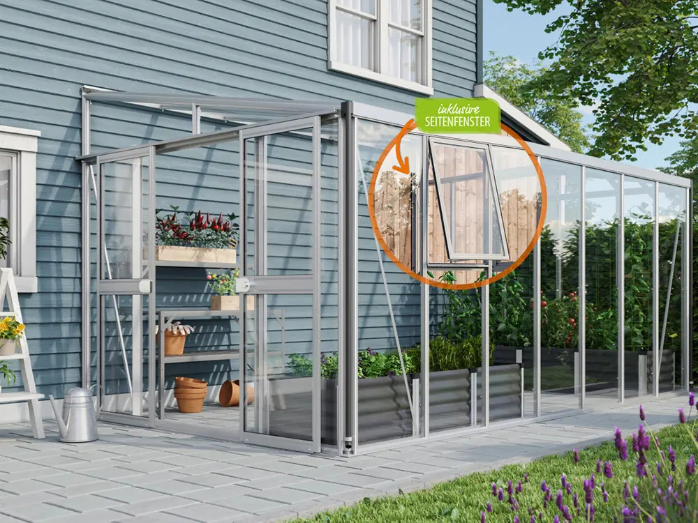 De zijwanden zijn voorzien van 3 mm dik, kristalhelder veiligheidsglas (ESG). Het dak is uitgerust met 10 mm dikke dubbelwandige polycarbonaatplaten, die planten beschermen tegen sterke zonnestraling, een stabiele temperatuur behouden en bestand zijn tegen vallende takken.