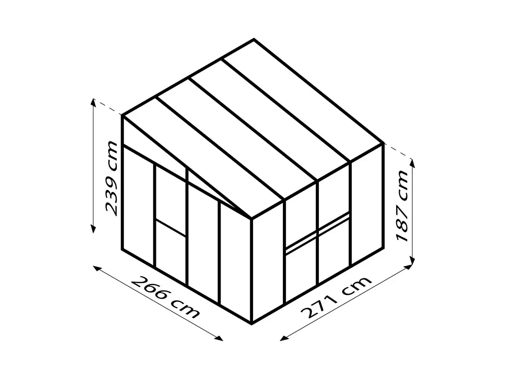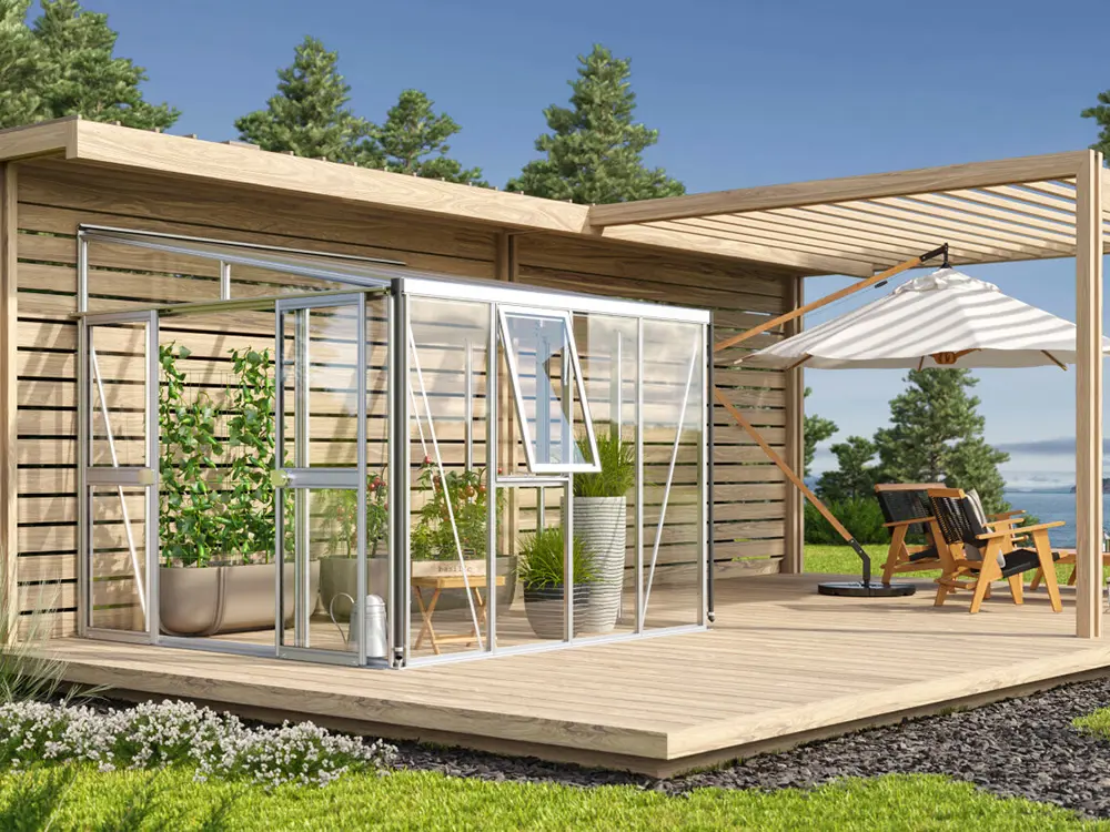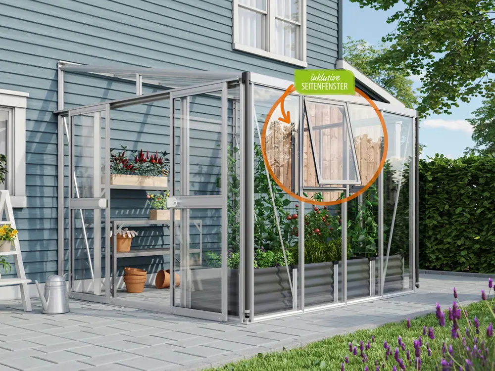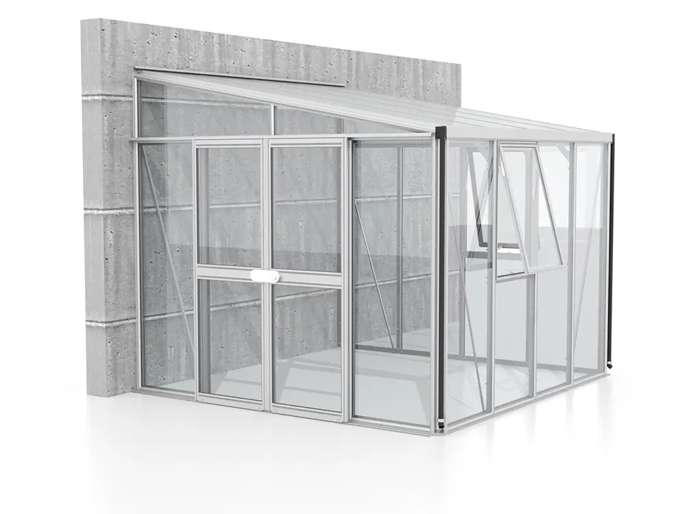 De zijwanden zijn voorzien van 3 mm dik, kristalhelder veiligheidsglas (ESG). Het dak is uitgerust met 10 mm dikke dubbelwandige polycarbonaatplaten, die planten beschermen tegen sterke zonnestraling, een stabiele temperatuur behouden en bestand zijn tegen vallende takken.