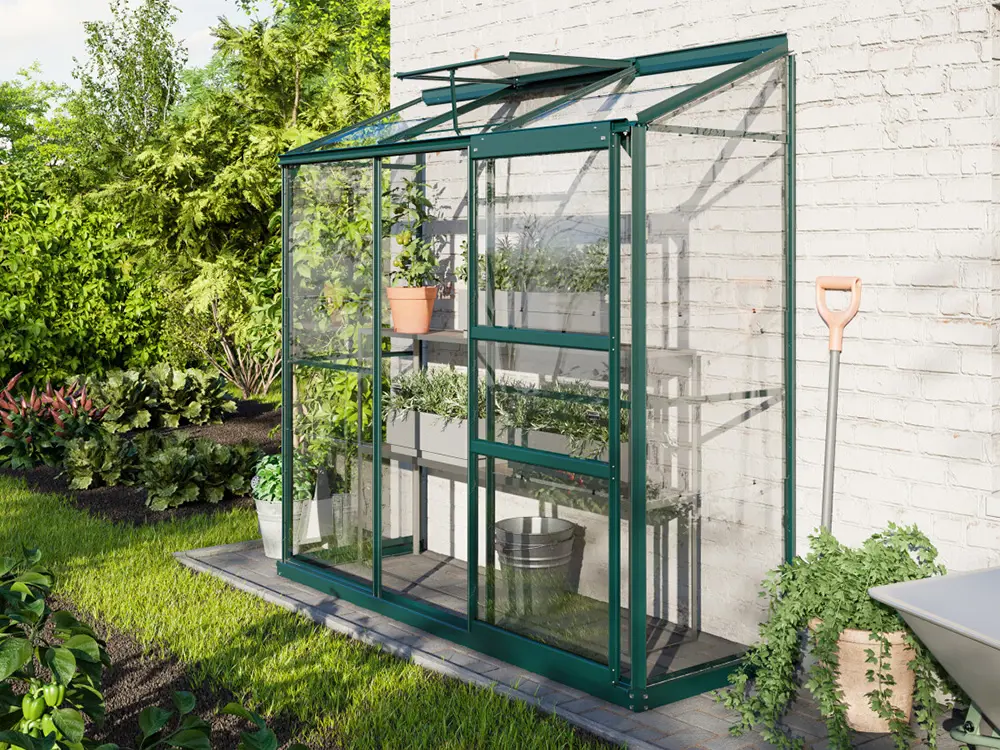 De profielen zijn gemaakt van gepoedercoat groen aluminium, wat ervoor zorgt dat ze er altijd als nieuw uitzien. Het frame is standaard voorzien van 3 mm veiligheidsglas. Als optie kan je kiezen voor een stalen fundering dat de kas met 6 cm verhoogt, waardoor het werken in de kas nog makkelijker wordt. Daarnaast zorgt deze extra fundering voor een vlottere opbouw en een steviger eindresultaat.