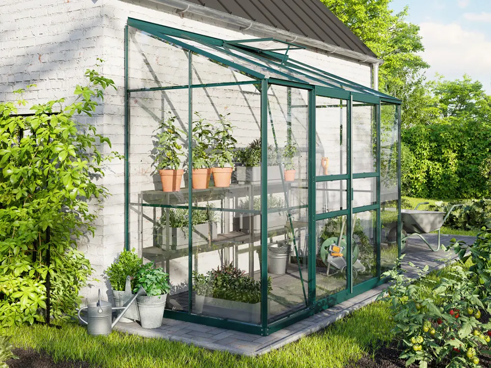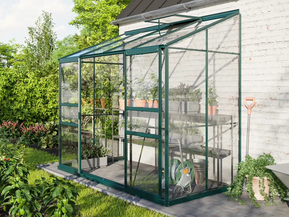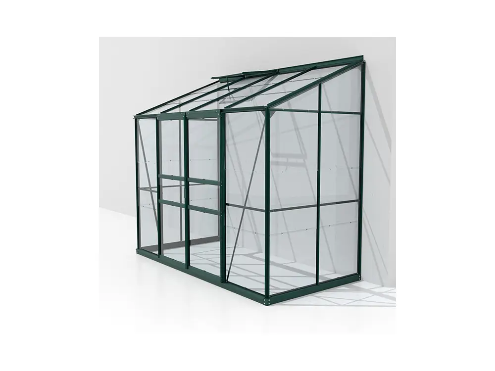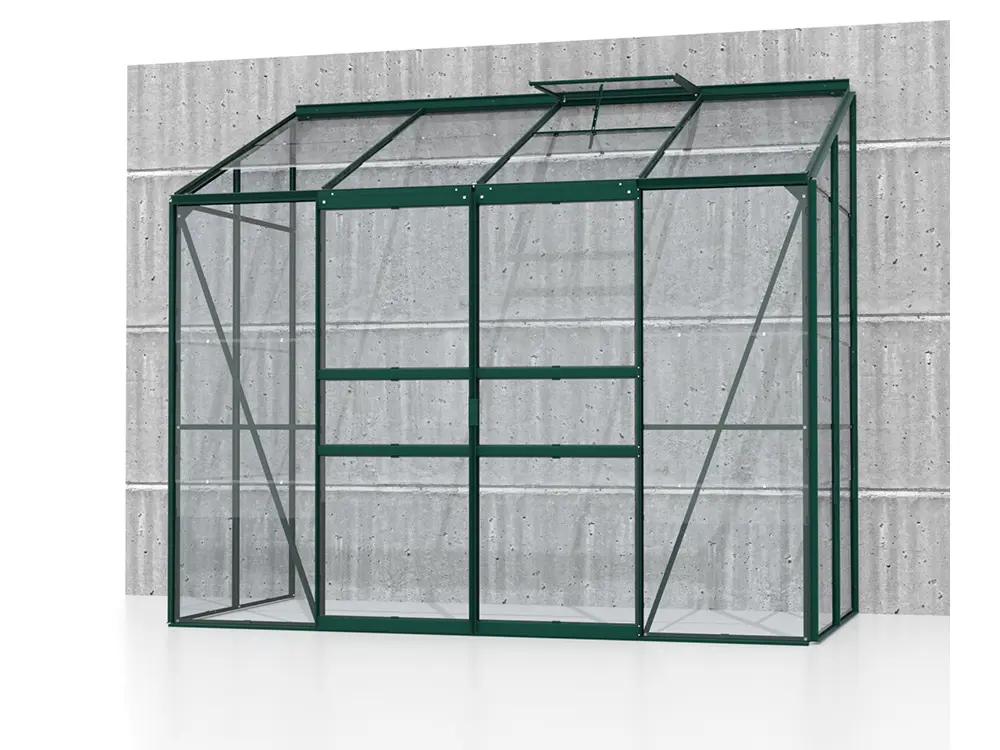 De profielen zijn gemaakt van gepoedercoat groen aluminium, wat ervoor zorgt dat ze er altijd als nieuw uitzien. Het frame is standaard voorzien van 3 mm veiligheidsglas. Als optie kan je kiezen voor een stalen fundering dat de kas met 6 cm verhoogt, waardoor het werken in de kas nog makkelijker wordt. Daarnaast zorgt deze extra fundering voor een vlottere opbouw en een steviger eindresultaat.