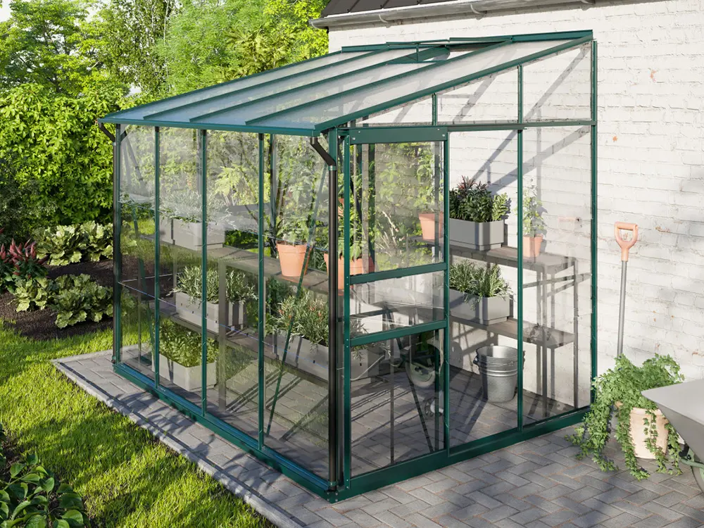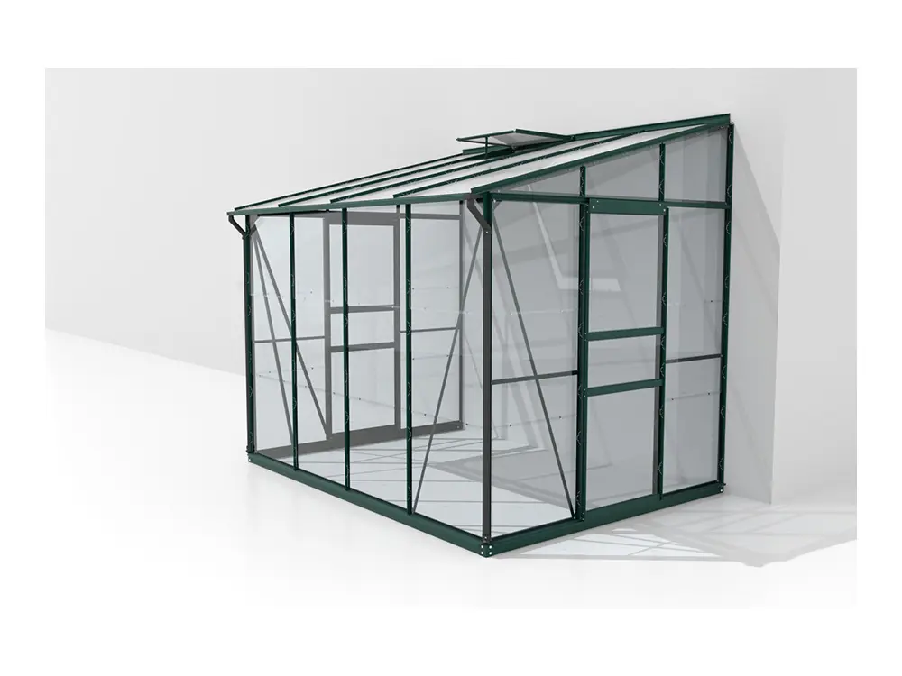 De profielen zijn gemaakt van gepoedercoat groen aluminium, wat ervoor zorgt dat ze er altijd als nieuw uitzien. Het frame is standaard voorzien van 3 mm veiligheidsglas. Als optie kan je kiezen voor een stalen fundering dat de kas met 6 cm verhoogt, waardoor het werken in de kas nog makkelijker wordt. Daarnaast zorgt deze extra fundering voor een vlottere opbouw en een steviger eindresultaat.