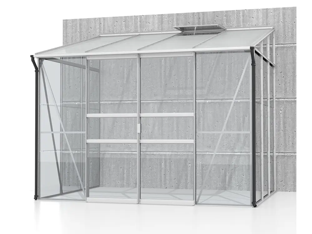 • Beglazing: 3 mm veiligheidsglas voor de wanden en polycarbonaat als dakbedekking
