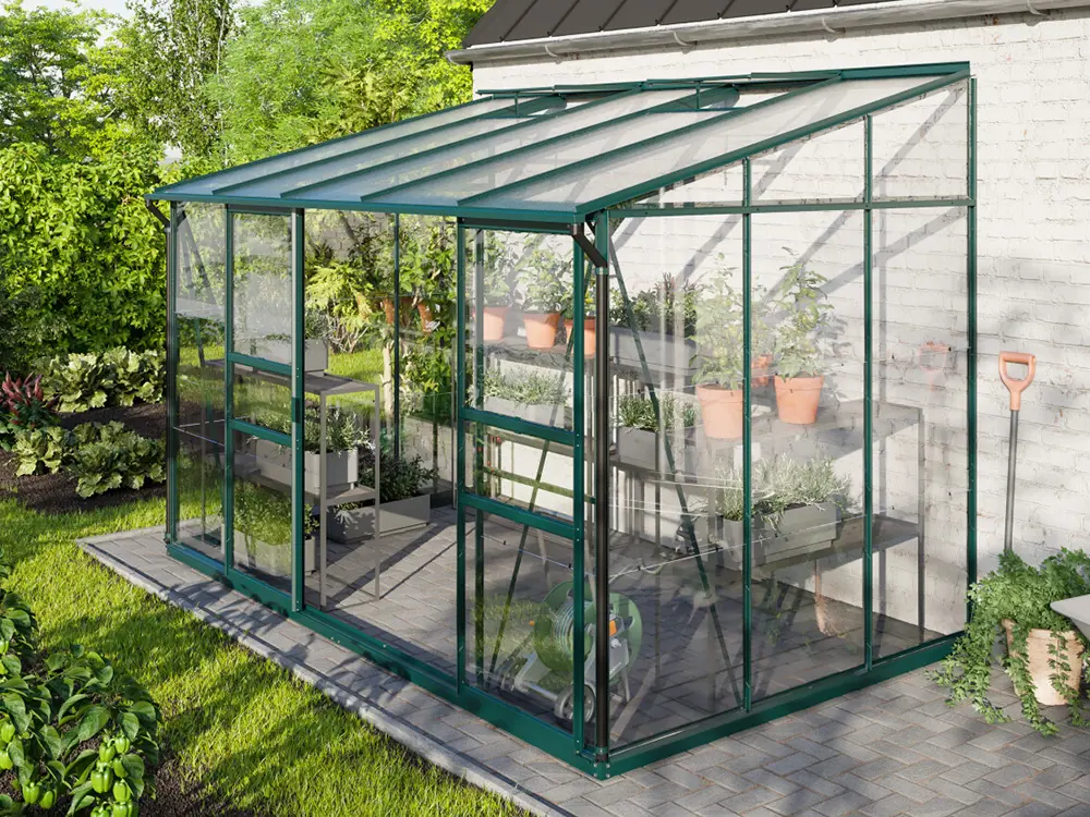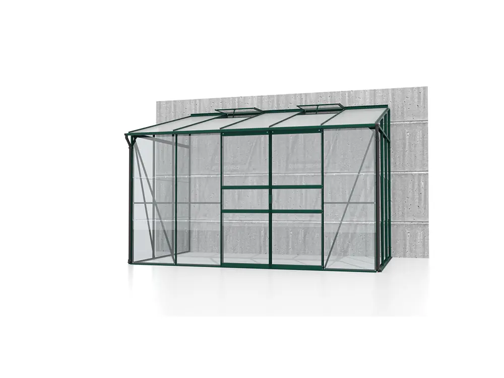 De profielen zijn gemaakt van gepoedercoat groen aluminium, wat ervoor zorgt dat ze er altijd als nieuw uitzien. Het frame is standaard voorzien van 3 mm veiligheidsglas. Als optie kan je kiezen voor een stalen fundering dat de kas met 6 cm verhoogt, waardoor het werken in de kas nog makkelijker wordt. Daarnaast zorgt deze extra fundering voor een vlottere opbouw en een steviger eindresultaat.