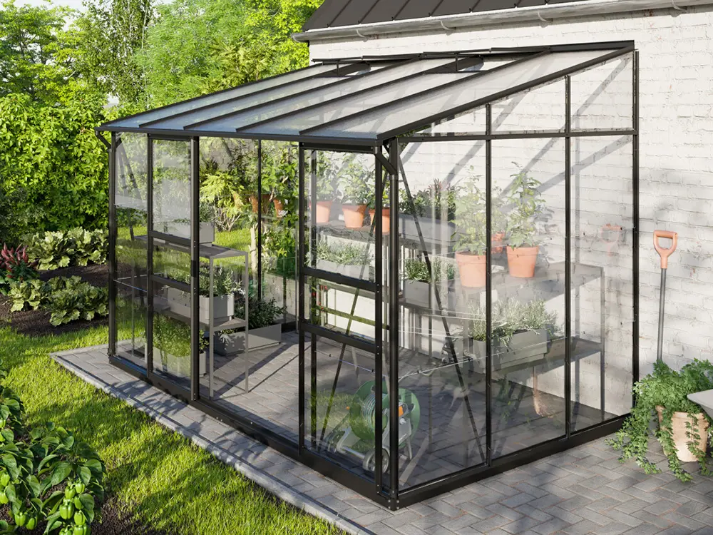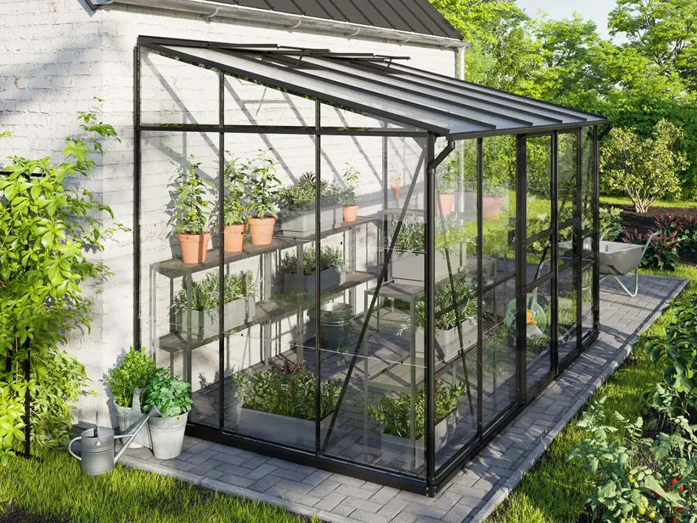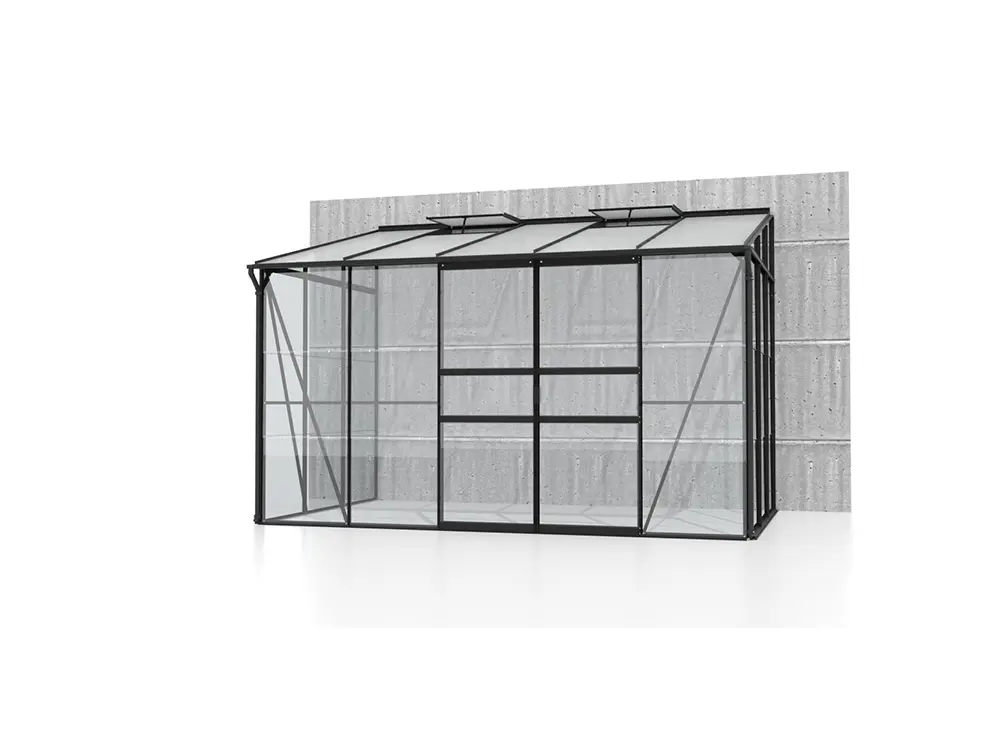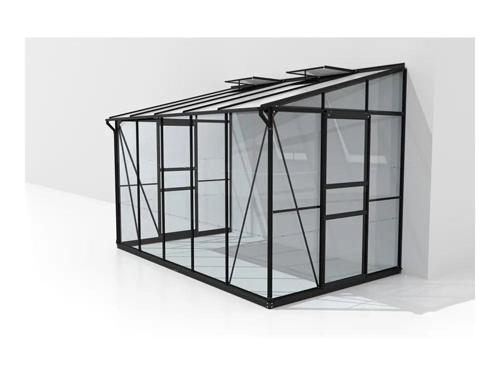 De hoge nok en de soepel schuivende enkele of dubbele deur maken de kas vlot toegankelijk, terwijl één of twee dakramen (afhankelijk van de grootte) zorgen voor een goed geventileerde ruimte. De robuuste profielen van gepoedercoat zwart aluminium blijven jarenlang mooi en onderhoudsvriendelijk. Het stevige frame is bovendien uitgerust met 3 mm veiligheidsglas