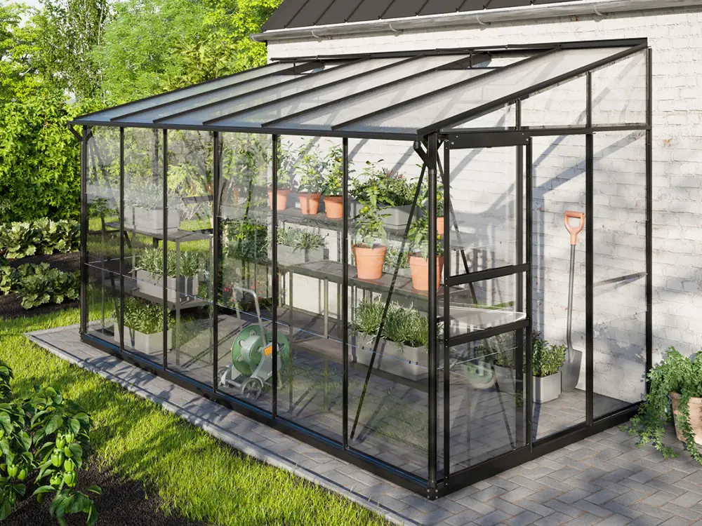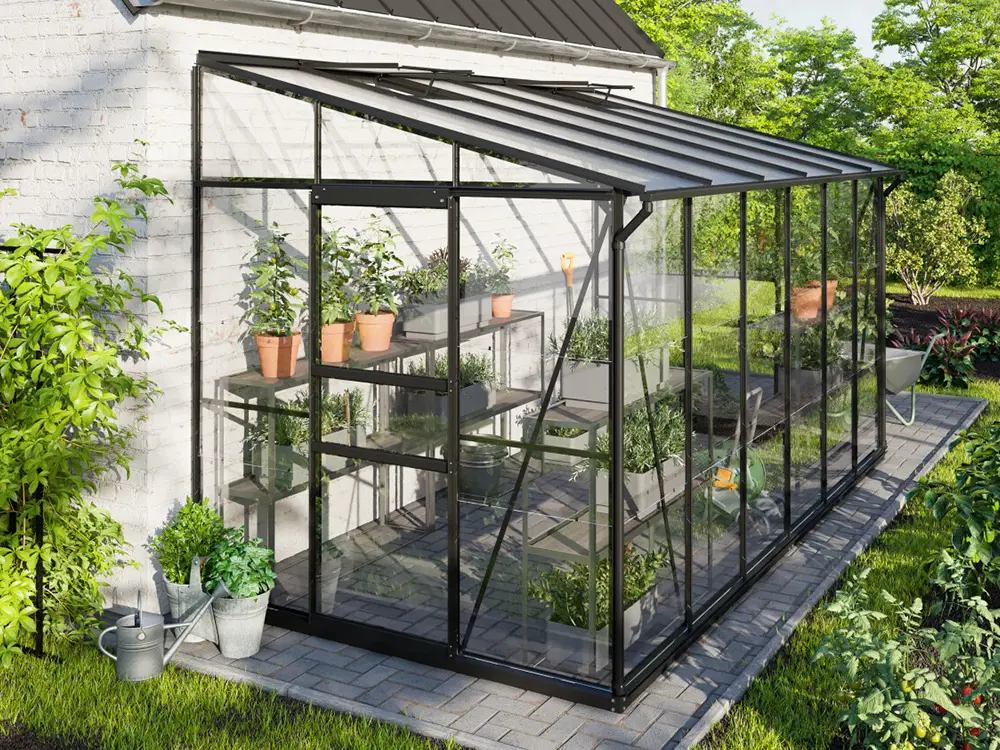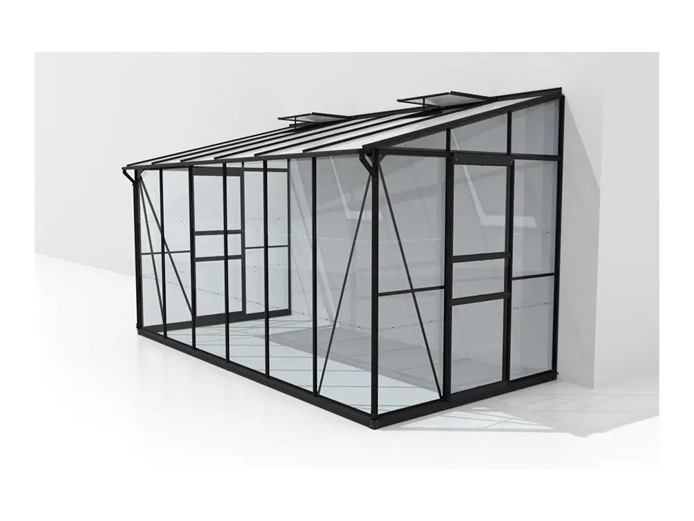 De hoge nok en de soepel schuivende enkele of dubbele deur maken de kas vlot toegankelijk, terwijl één of twee dakramen (afhankelijk van de grootte) zorgen voor een goed geventileerde ruimte. De robuuste profielen van gepoedercoat zwart aluminium blijven jarenlang mooi en onderhoudsvriendelijk. Het stevige frame is bovendien uitgerust met 3 mm veiligheidsglas
