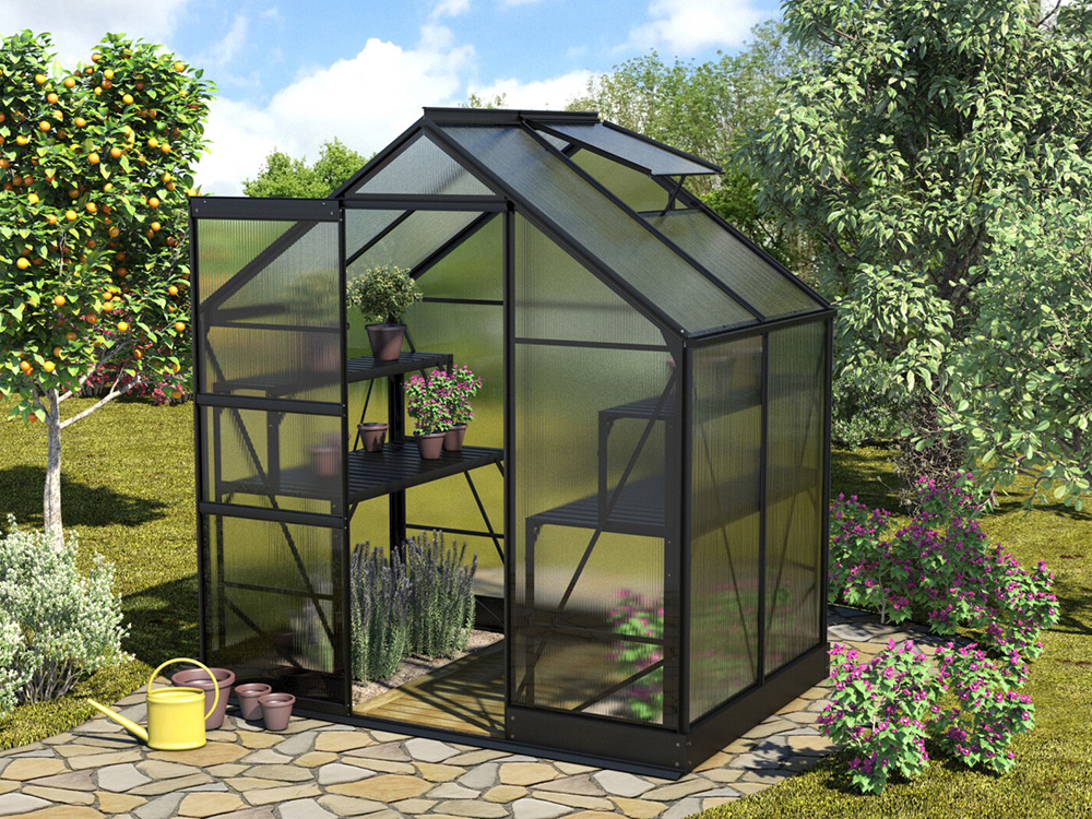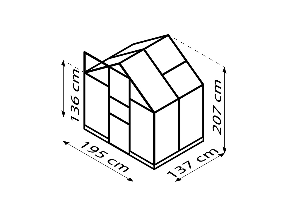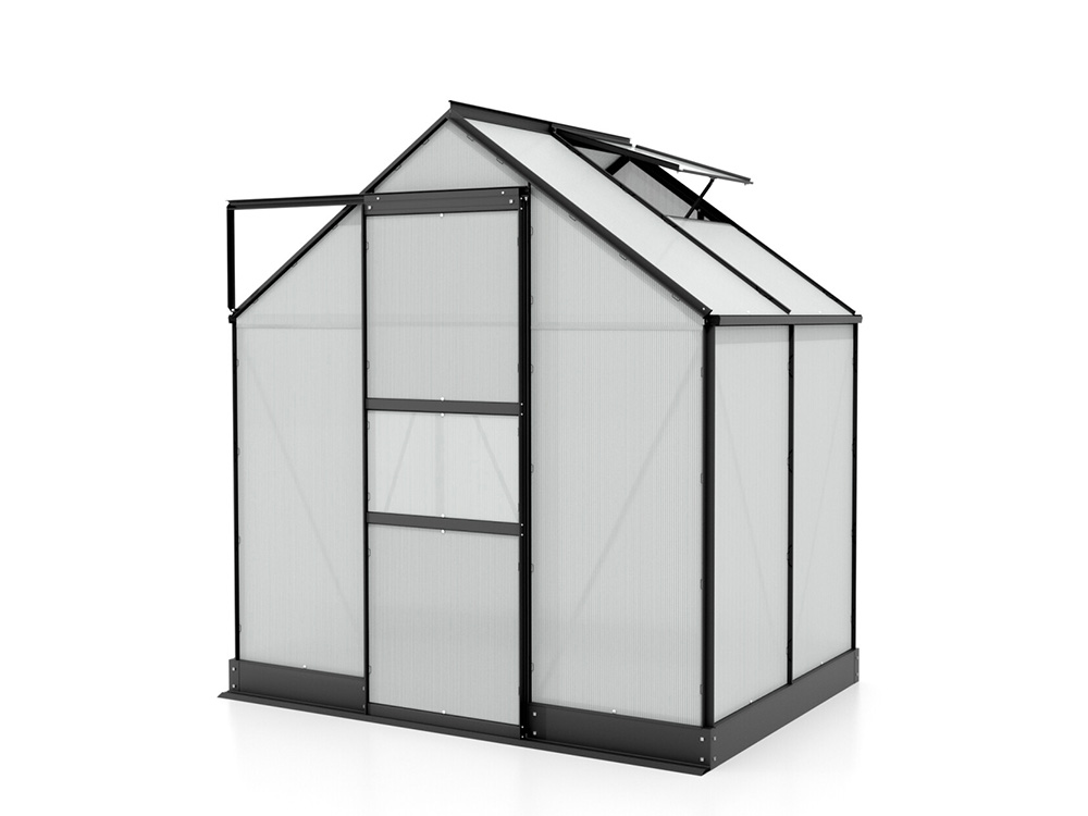 Het stevige frame is vervaardigd uit zwart poedergecoat aluminium, wat zorgt voor een luxueuze uitstraling. De schuifdeur, met een breedte van 61 cm, kan zo worden gemonteerd dat ze zowel naar links als naar rechts kan openen. Daarnaast is de kas uitgerust met geïntegreerde dakgoten en een fundering die zorgt voor een solide en stabiele verbinding met het frame.