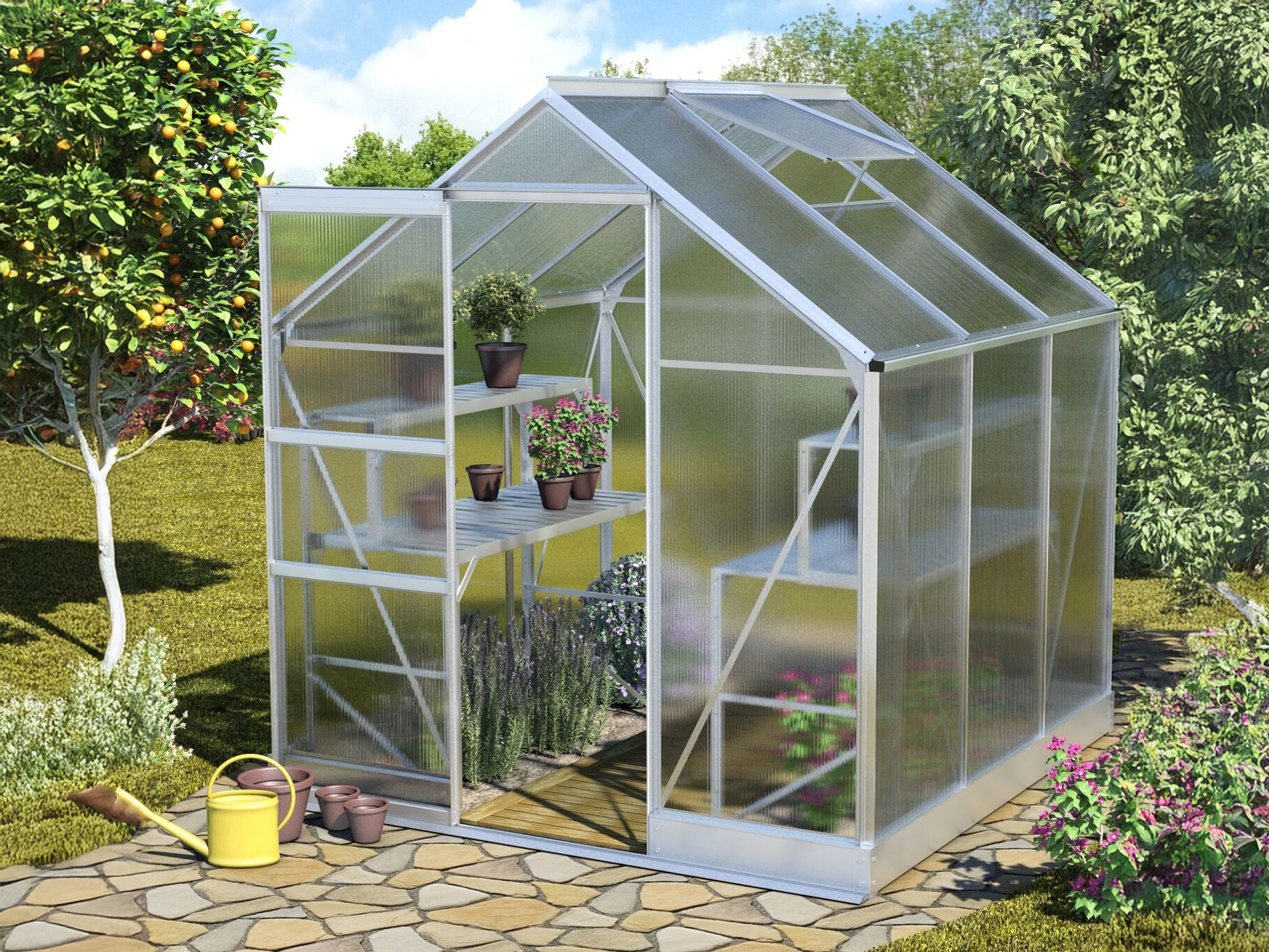 Het frame bestaat uit duurzaam geanodiseerd aluminium zodat de tuinkas er jarenlang als nieuw uitziet. Standaard wordt de tuinkas geleverd met 4 mm polycarbonaatplaten. Deze dubbelwandige platen zijn licht van gewicht, bijna onbreekbaar en bieden een uitstekende isolatie! In optie kan je kiezen voor 6 mm polycarbonaat.