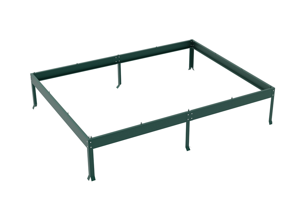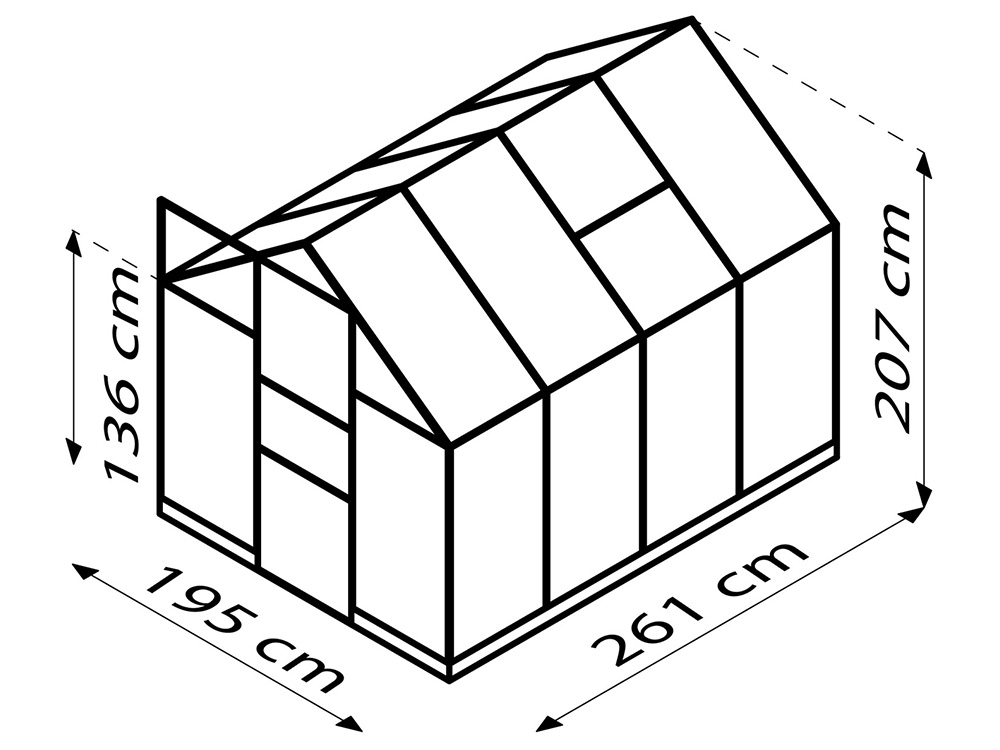 Het frame is opgebouwd uit groen poedergecoate aluminium profielen. De schuifdeur van 61 cm breed kan zo worden opgehangen dat ze zowel naar links als naar rechts kan openen. De kas is tevens voorzien van geïntegreerde dakgoten en fundering in het kasframe. De fundering zorgt voor een stevige en optimale verbinding tussen het frame en de fundering.