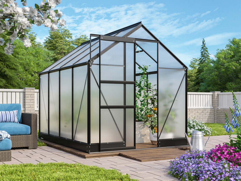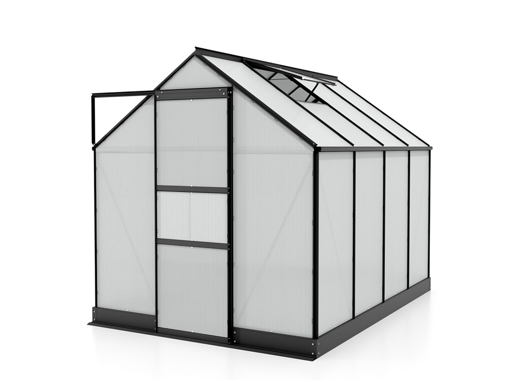 Het stevige frame is vervaardigd uit zwart poedergecoat aluminium, wat zorgt voor een luxueuze uitstraling. De schuifdeur, met een breedte van 61 cm, kan zo worden gemonteerd dat ze zowel naar links als naar rechts kan openen. Daarnaast is de kas uitgerust met geïntegreerde dakgoten en een fundering die zorgt voor een solide en stabiele verbinding met het frame.