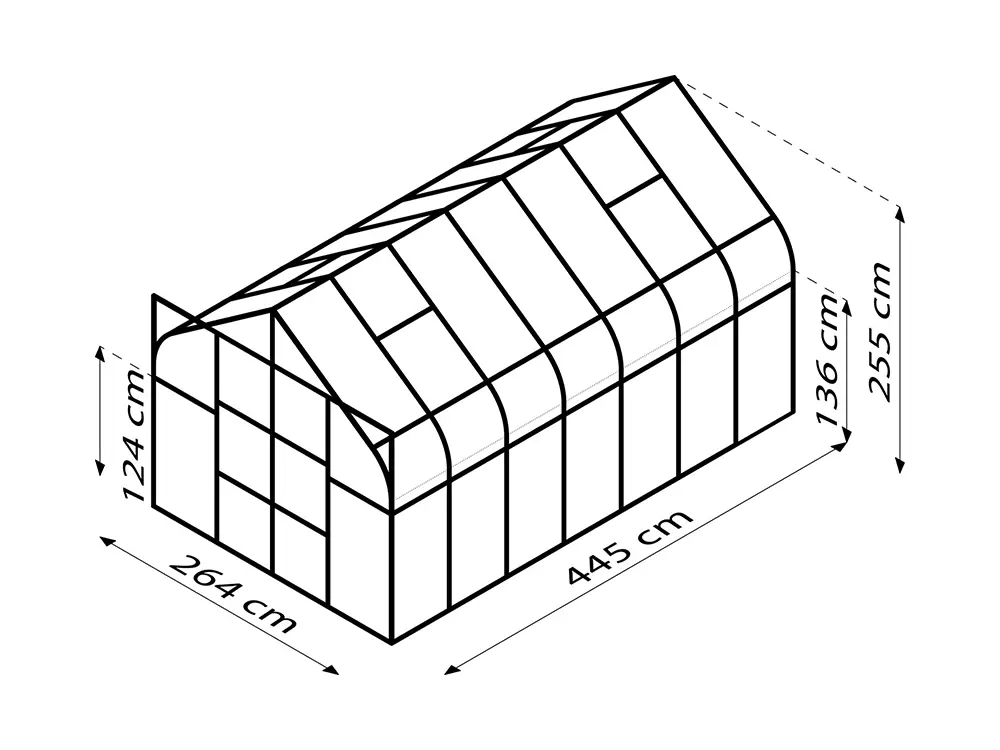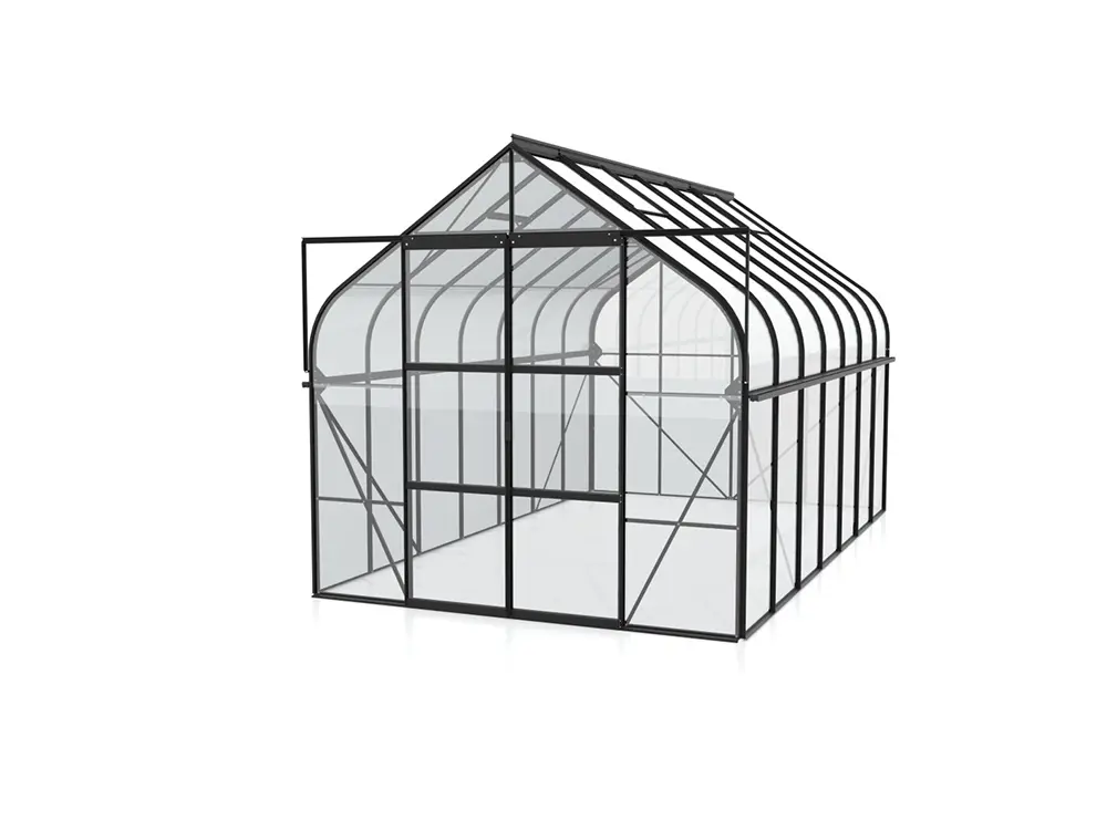 De kas is vervaardigd uit robuust, zwart gepoedercoat aluminium en standaard voorzien van 3 mm veiligheidsglas, wat zorgt voor een stevige constructie en maximale lichtinval. De gebogen randen zijn afgewerkt met UV-bestendige, heldere polycarbonaatplaten. Praktische extra's zijn geïntegreerde goten en 2 tot 4 dakramen (afhankelijk van de grootte). Deze zorgen voor een uitstekende ventilatie en een optimaal groeiklimaat.