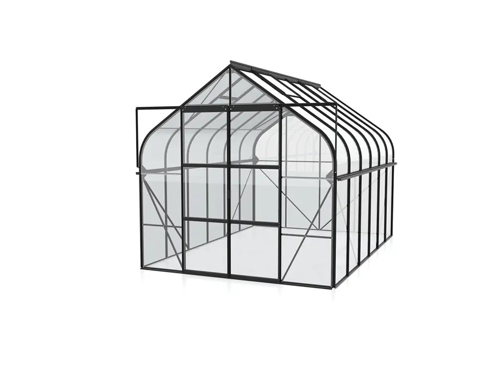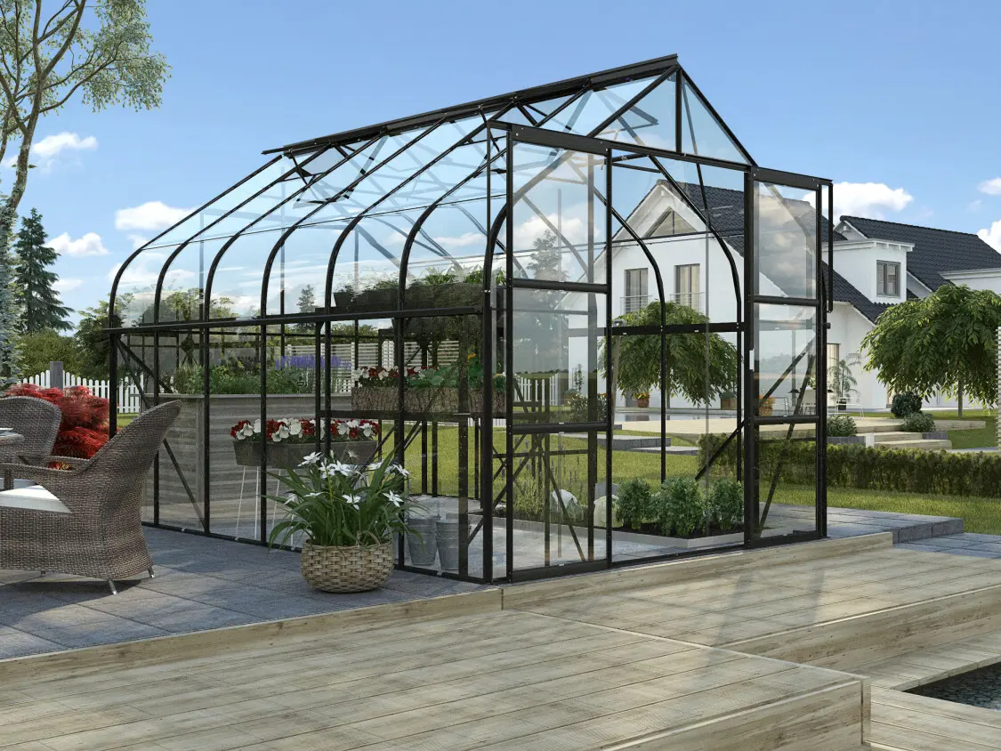 De kas is vervaardigd uit robuust, zwart gepoedercoat aluminium en standaard voorzien van 3 mm veiligheidsglas, wat zorgt voor een stevige constructie en maximale lichtinval. De gebogen randen zijn afgewerkt met UV-bestendige, heldere polycarbonaatplaten. Praktische extra's zijn geïntegreerde goten en 2 tot 4 dakramen (afhankelijk van de grootte). Deze zorgen voor een uitstekende ventilatie en een optimaal groeiklimaat.