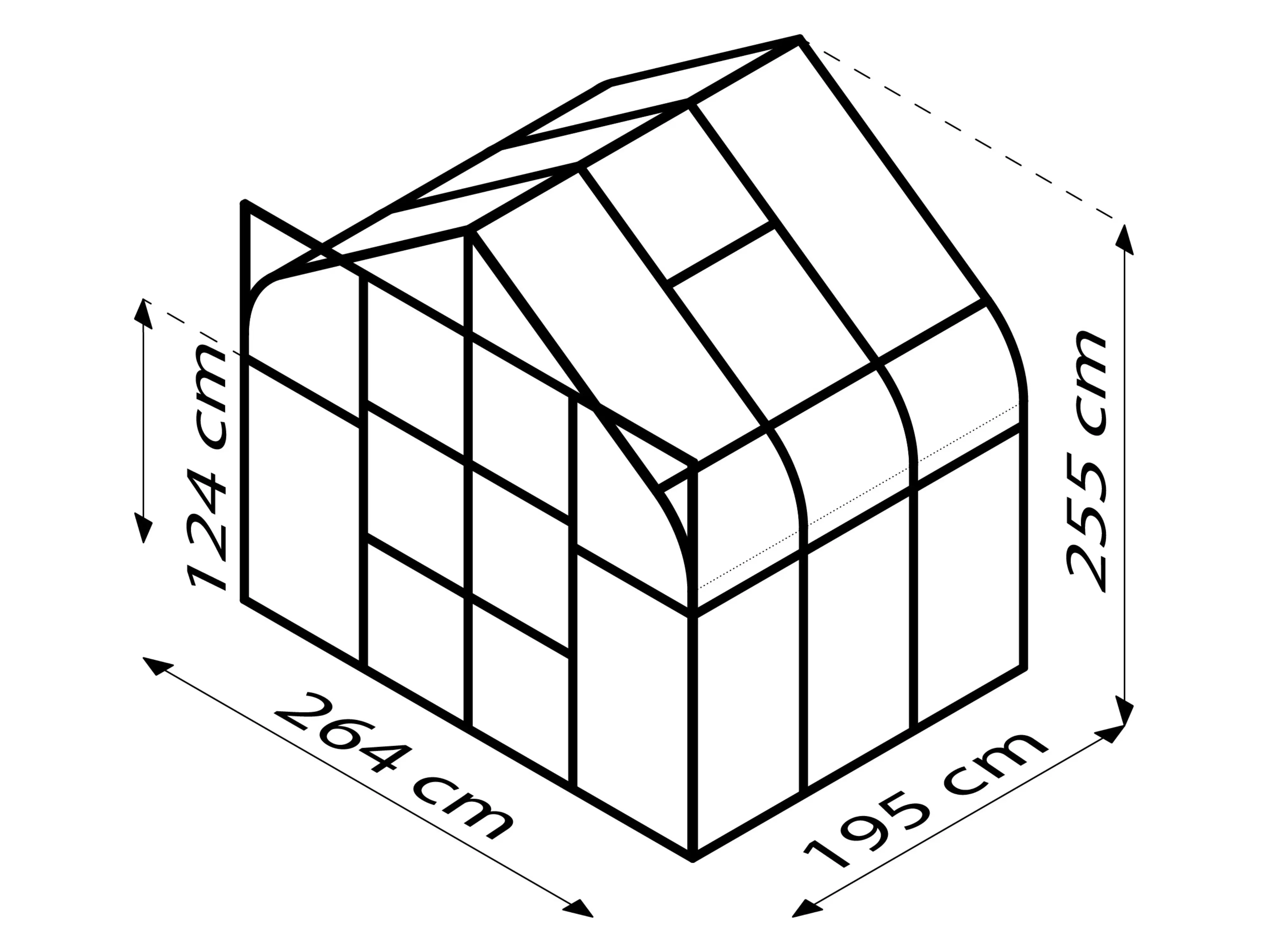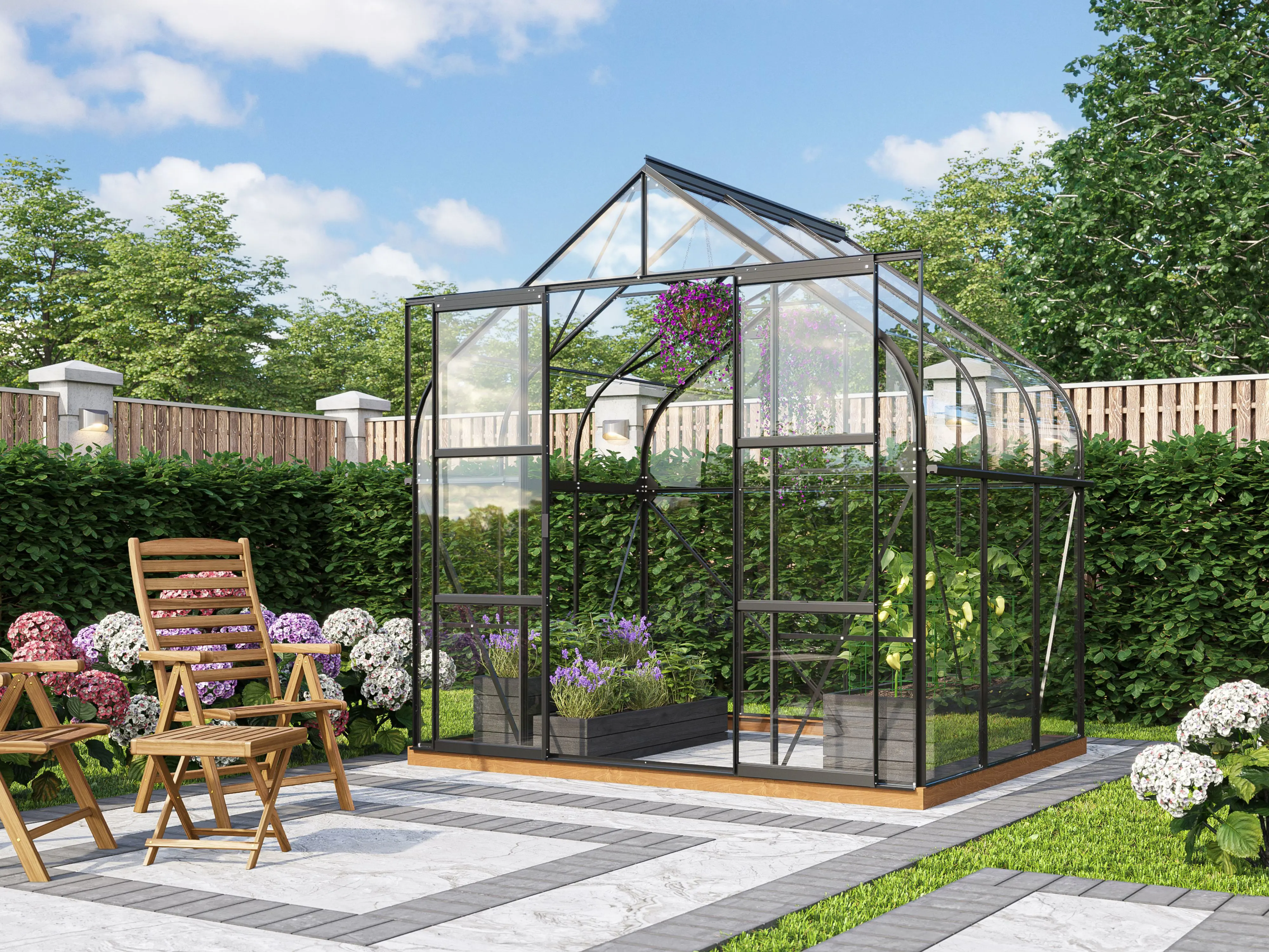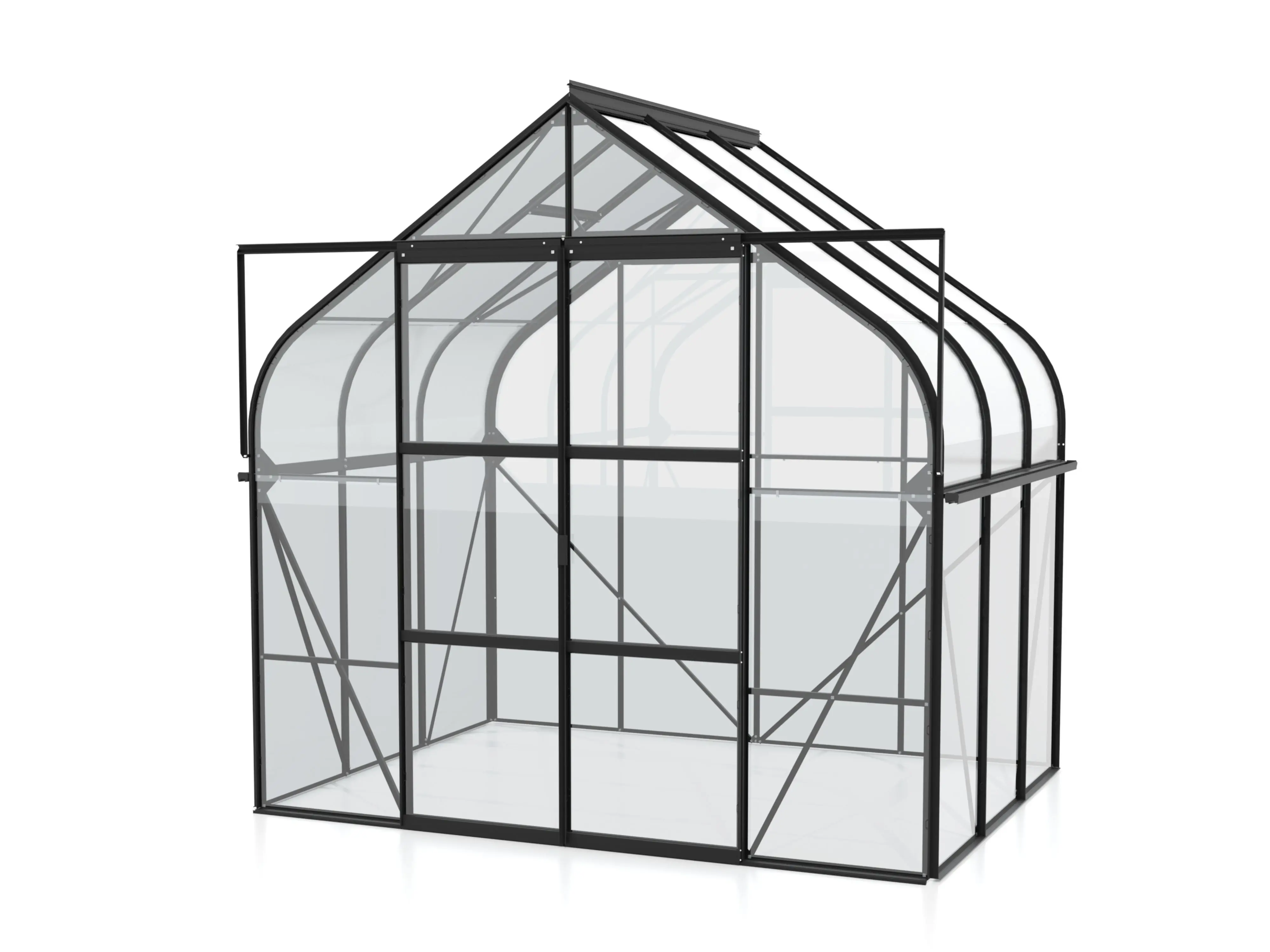 De kas is vervaardigd uit robuust, zwart gepoedercoat aluminium en standaard voorzien van 3 mm veiligheidsglas, wat zorgt voor een stevige constructie en maximale lichtinval. De gebogen randen zijn afgewerkt met UV-bestendige, heldere polycarbonaatplaten. Praktische extra's zijn geïntegreerde goten en 2 tot 4 dakramen (afhankelijk van de grootte). Deze zorgen voor een uitstekende ventilatie en een optimaal groeiklimaat.