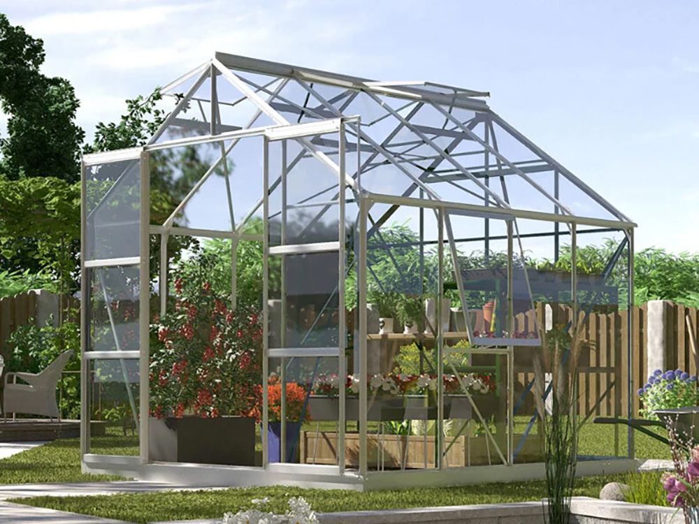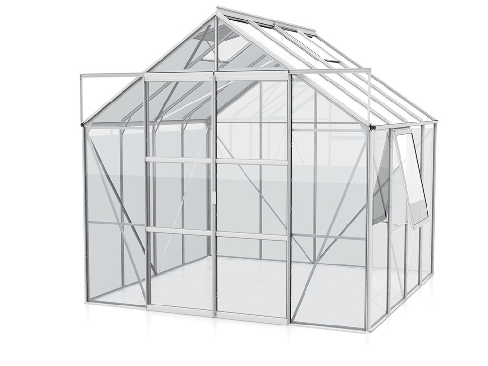 Creëer de ideale omgeving om te kweken, te zaaien en te oogsten met de ruime tuinkas Jupiter van Vitavia. Het is een topmodel uitgerust met een dubbele schuifdeur, 2 tot 4 dakramen afhankelijk van de grootte, en een extra zijvenster, elk voorzien van uitzetters om voor voldoende ventilatie te zorgen.