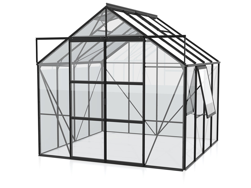 Creëer de ideale omgeving om te kweken, te zaaien en te oogsten met de ruime tuinkas Jupiter van Vitavia. Het is een topmodel uitgerust met een dubbele schuifdeur, 2 tot 4 dakramen afhankelijk van de grootte, en een extra zijvenster, elk voorzien van uitzetters om voor voldoende ventilatie te zorgen.
